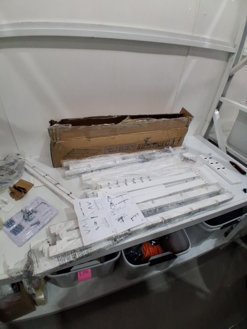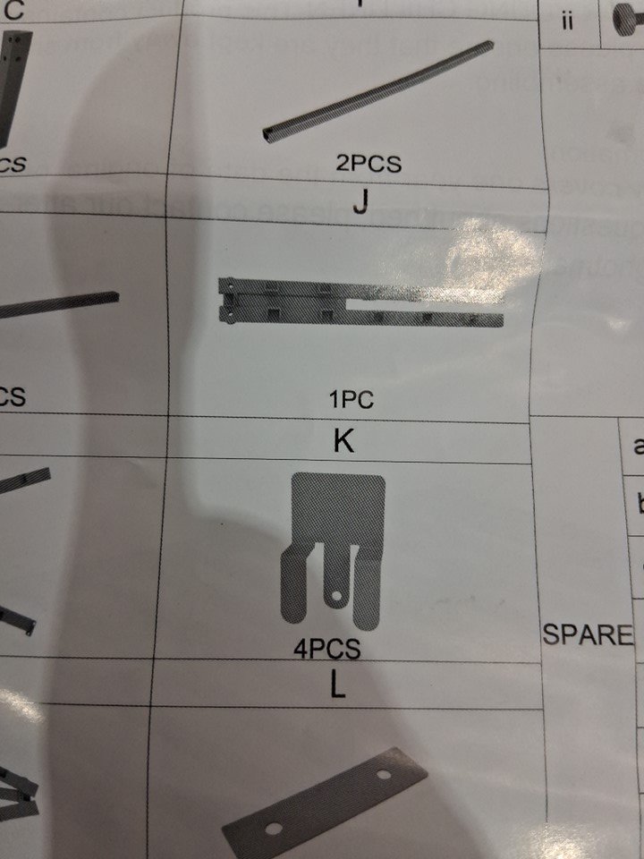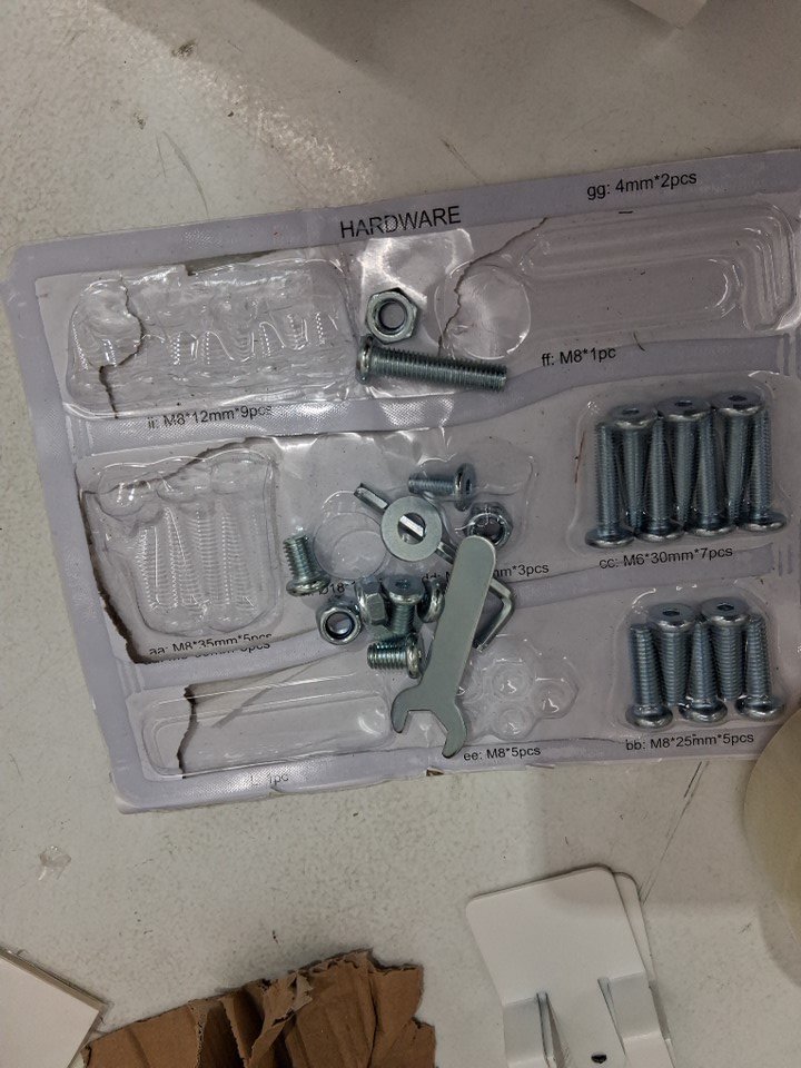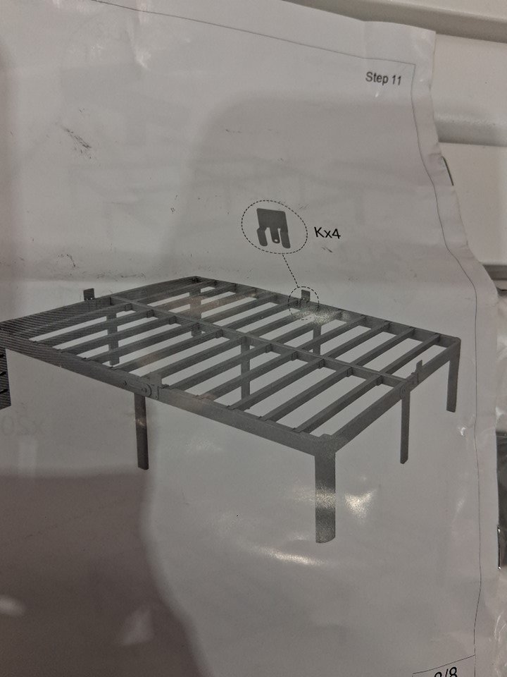 Missing Optional K Pieces (Holds mattress in place). Missing basic hardware, all listed on hardware packaging.