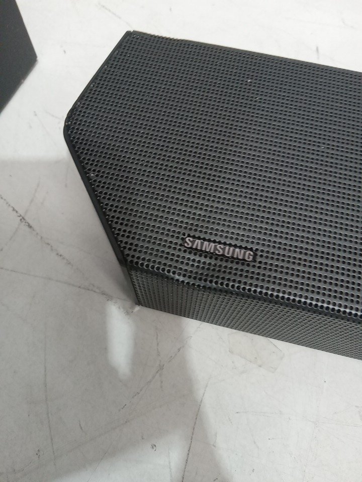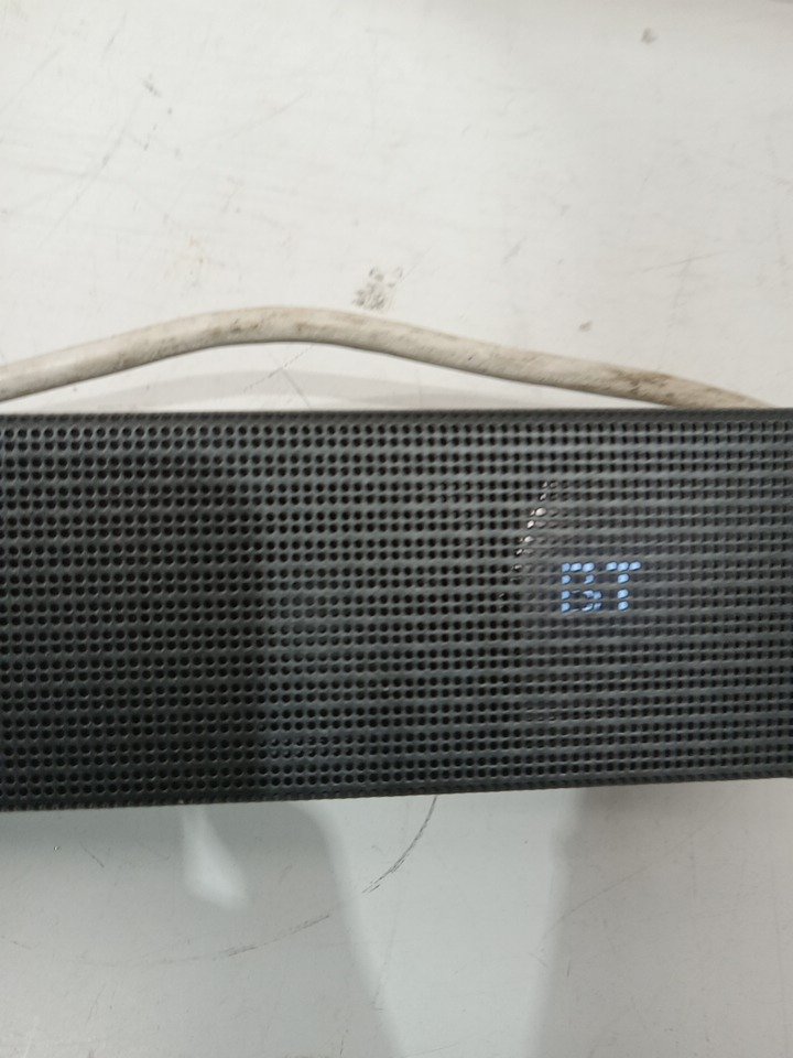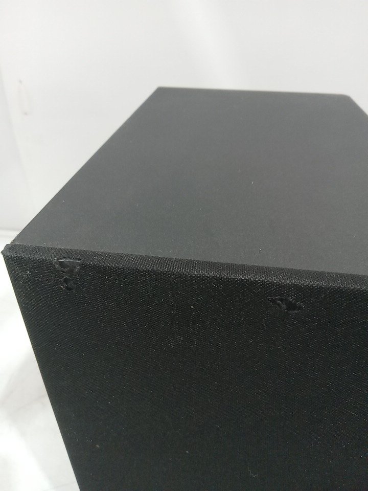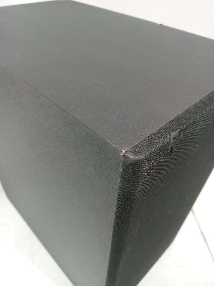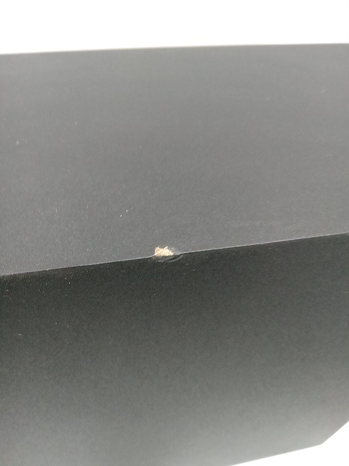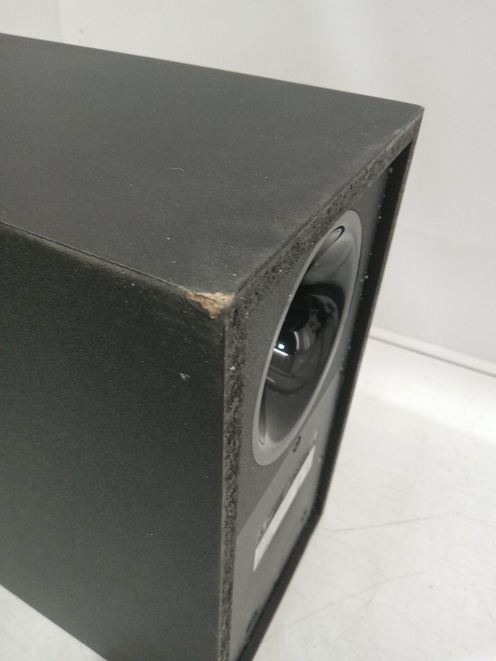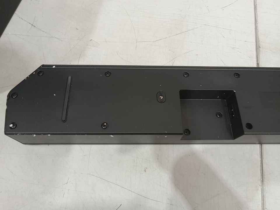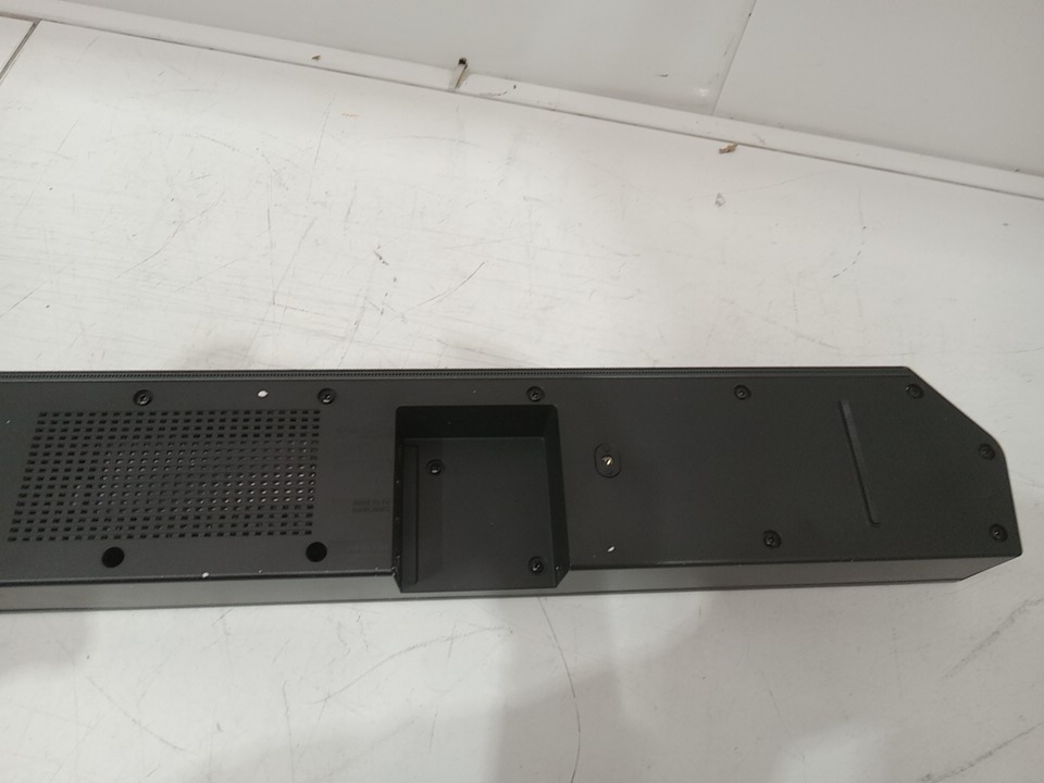 There are dents on the soundbar near the logo and on the top, as well as scratch marks on the base. The mesh on the top has cuts, and there are additional dents on the top left corner, the top right middle area, and a dent/chip on the top back right corner. However, there is no issue with the sound quality. Tested for power and functionality. (Please see photos)