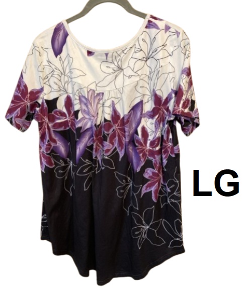 woman's Floral Short Sleeve Top - LARGE - white\black\purple - floral