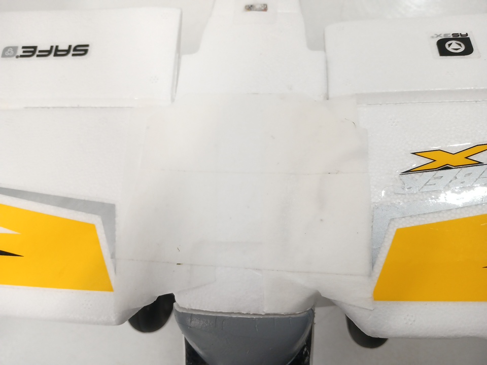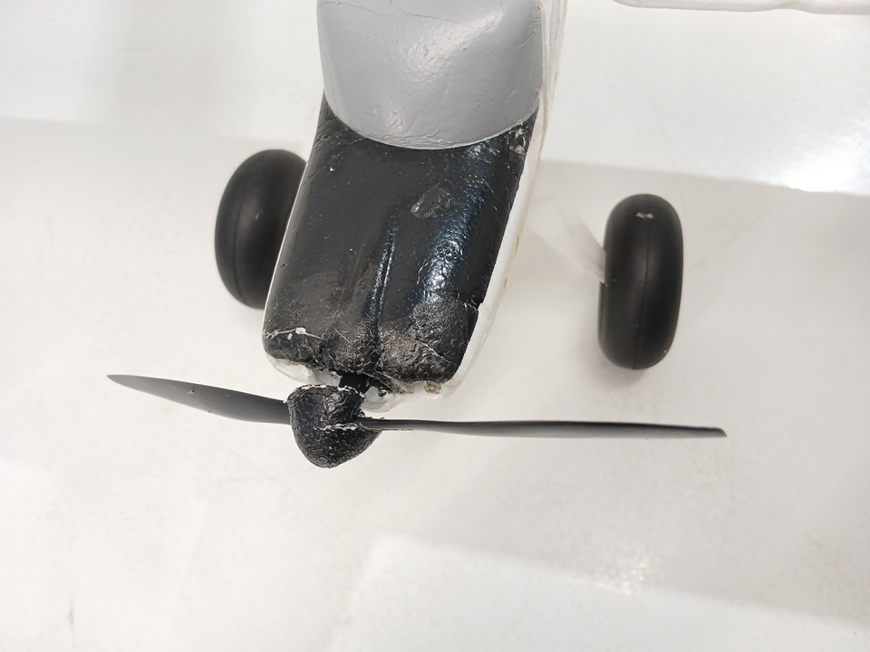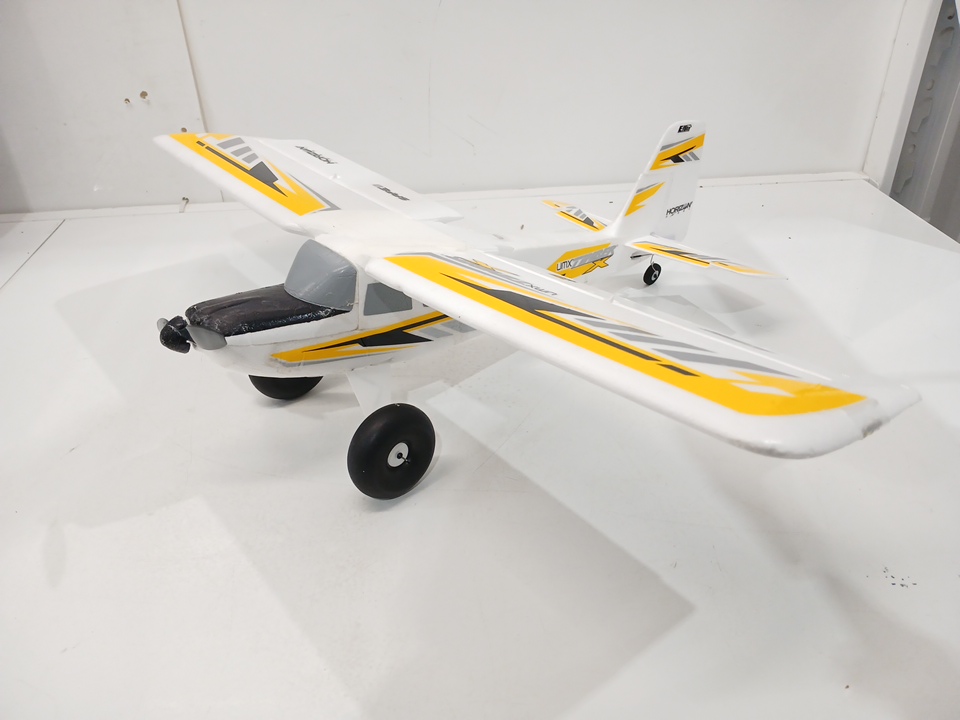 Transmitter, battery, and charger are not included and are sold separately. This item has tape on its wings and its nose has some damage