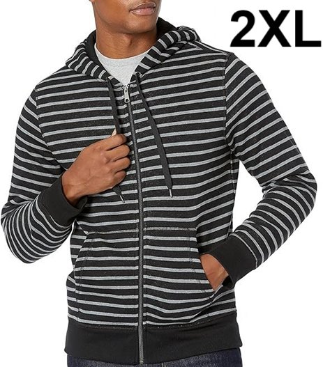 MEN'S AMAZON ESSENTIALS FULL ZIP HOODED FLEECE SWEATSHIRT - 2XL - BLACK/GREY STRIPE (MODEL: F17AE50002)