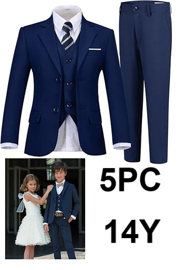 5pc boy's Diaryan FORMAL Suit with jacket, pant, vest, shirt and tie - 14Y - navy blue/white