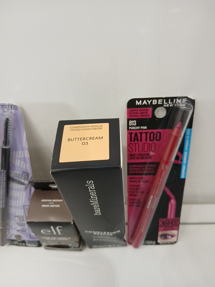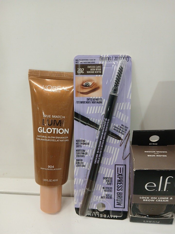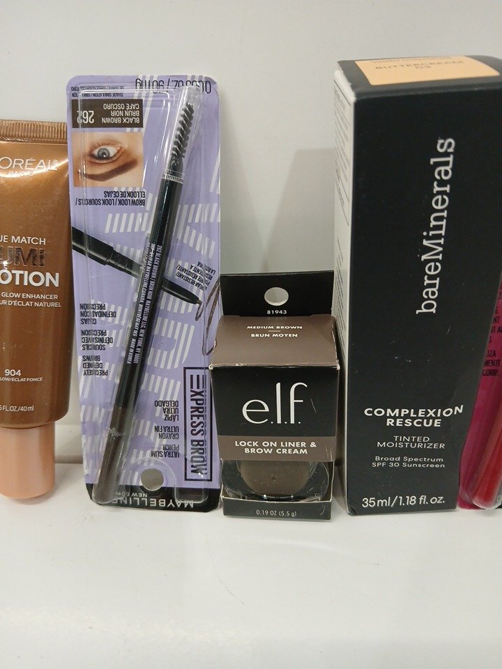 5 assorted makeup - ASSORTED COLORS, TYPES AND BRANDS - moisturizer/ eye liner/ brow cream/ lumi glotion