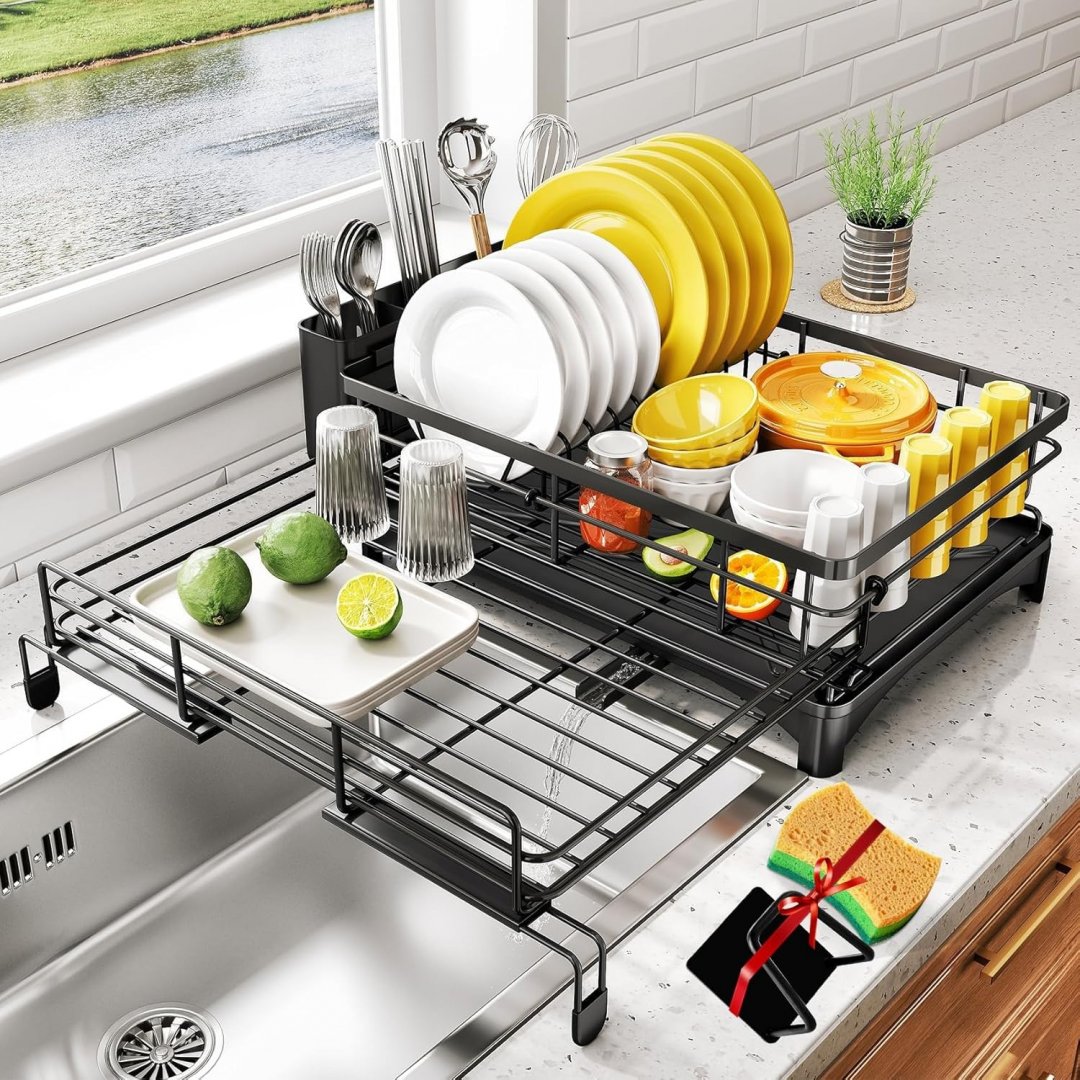 LARGE Expandable DRYING DISH Rack for Kitchen Counter, Rust-Proof with Utensil Holder AND A CLEANING SPONGE - Black
