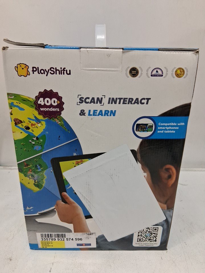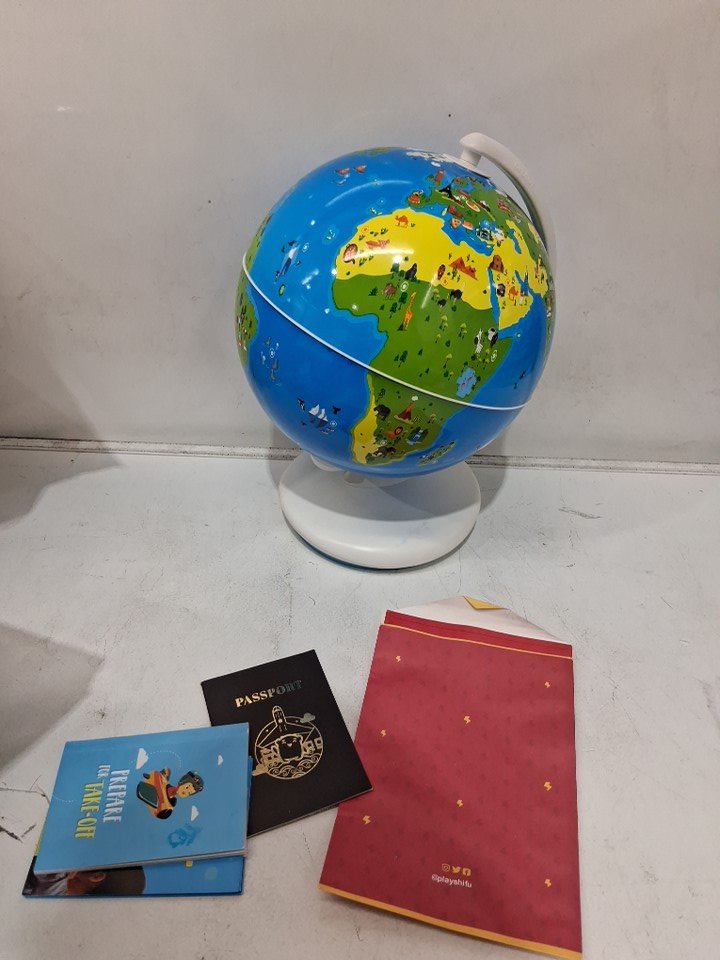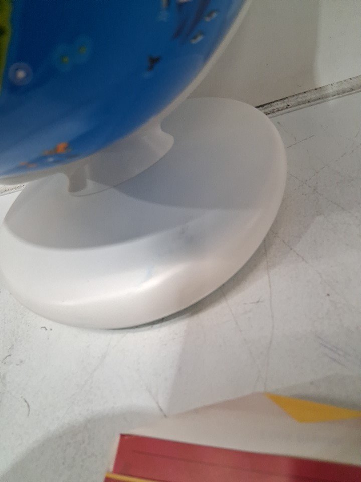 Signs of use due to smudge/scuff on base, one of the feet pads on the globe is missing.