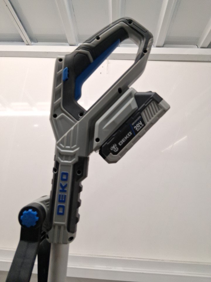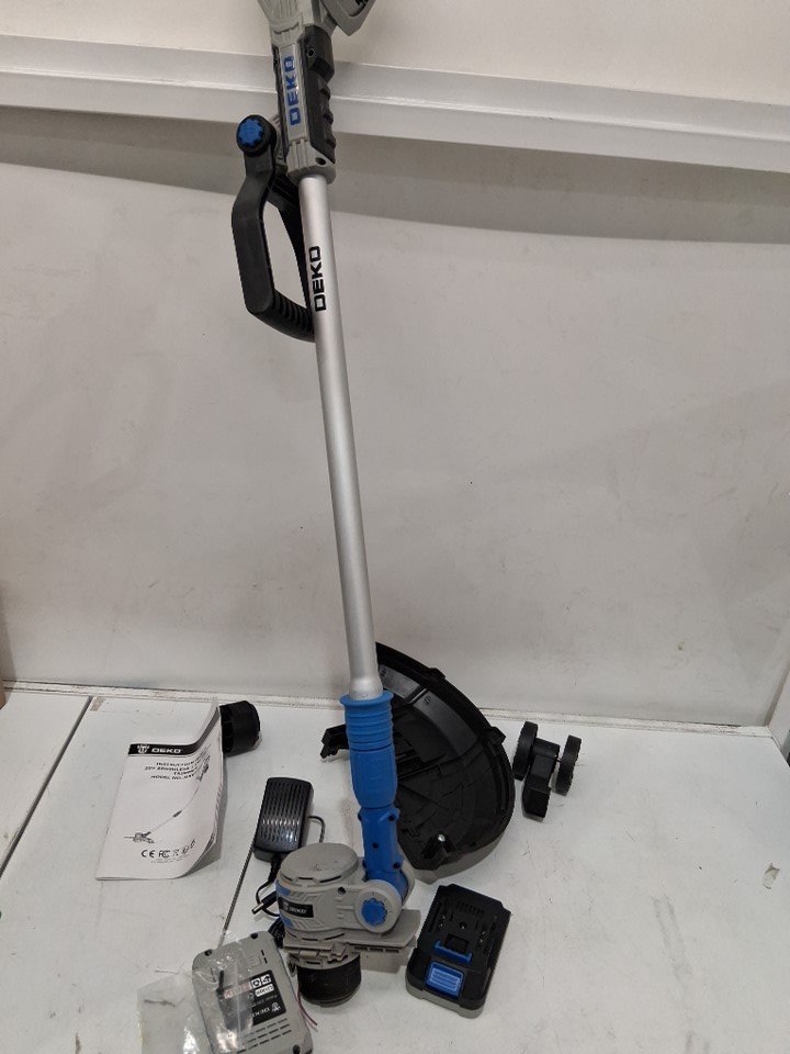 DEKOPRO String Trimmer Cordless Battery Powered Brushless Electric Weed Wacker Eater 2 in 1 Lawn Trimmer Edger, 2 Batteries, Charger, Line Feed - Blue - 12" - 20V (model: DKGT2001BL)