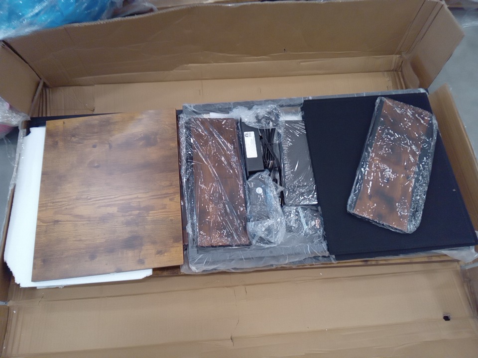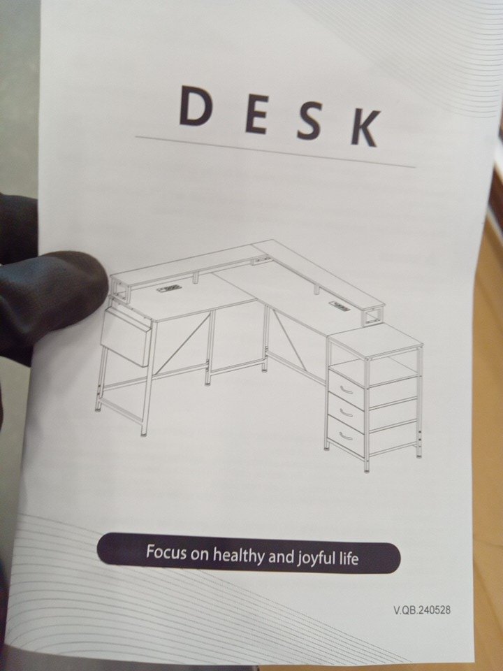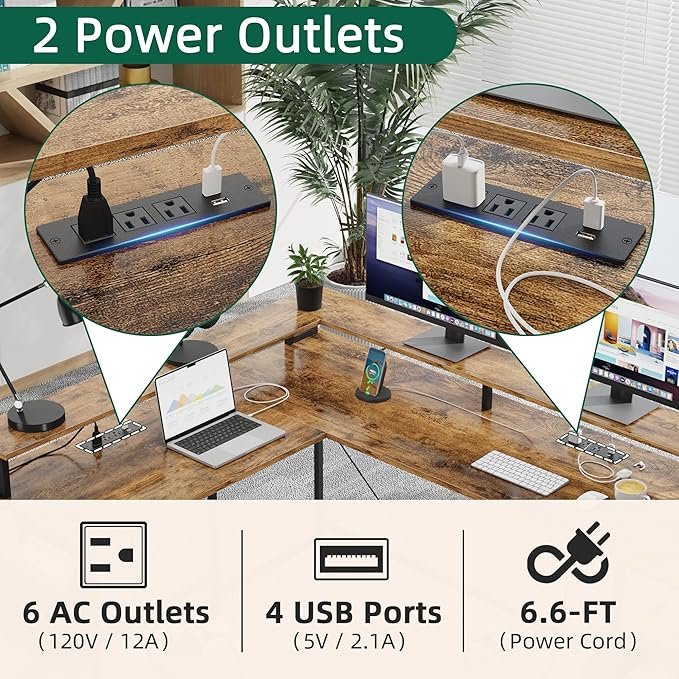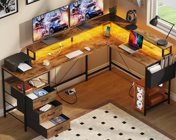GYIIYUO L Shaped Desk, with LED lights and 2 power strips - 64" - black/rustic brown (model: