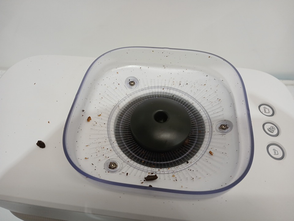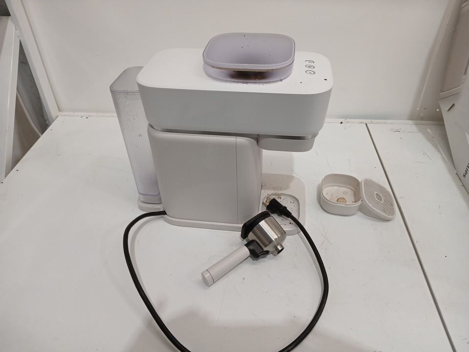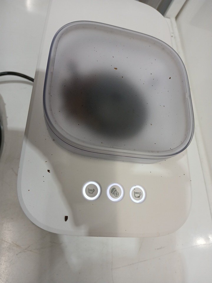 the machine has been tested for power and has coffee grinds in and around the machine.