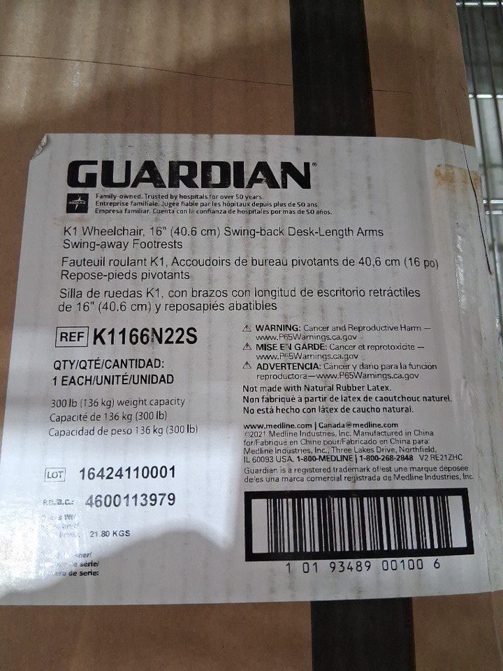 MEDLINE GUARDIAN K1 WHEELCHAIR - 300LB CAP - BLACK (MODEL: K1166N22S)