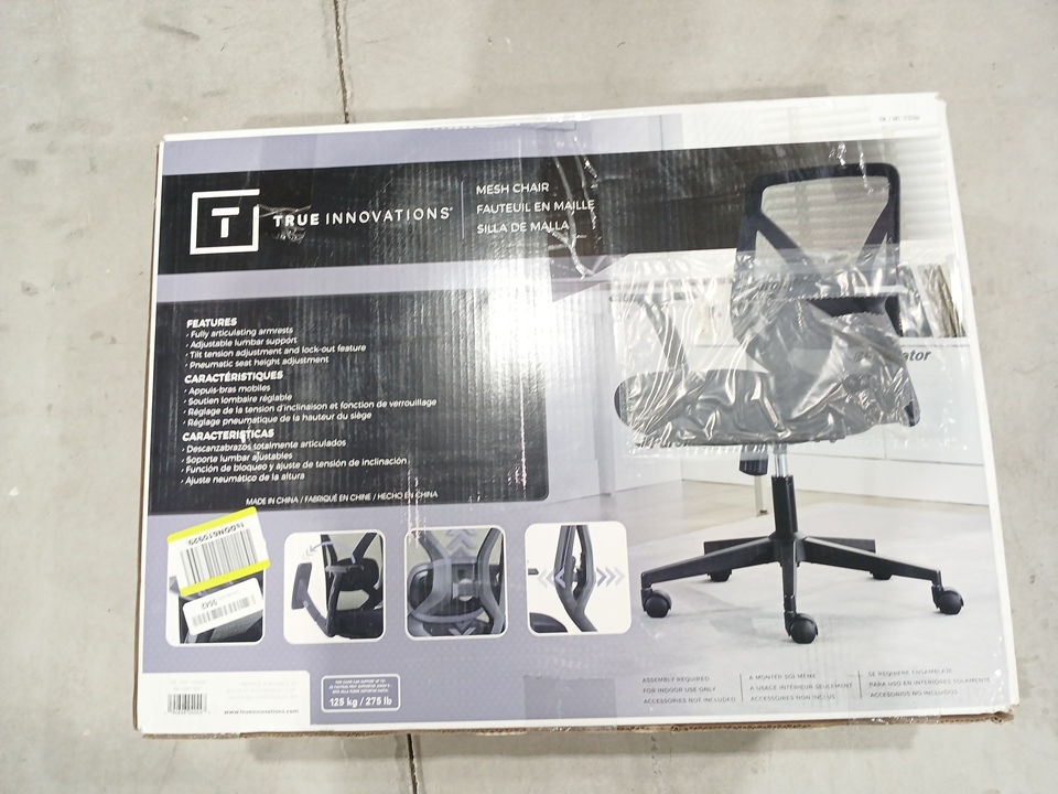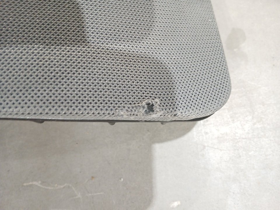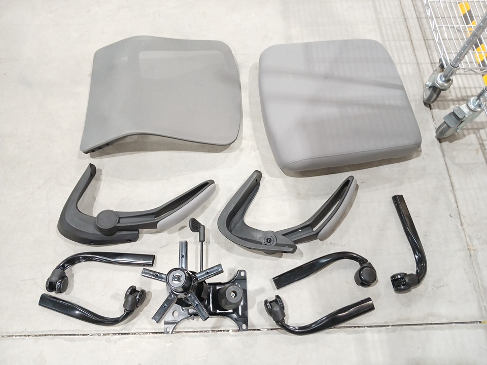 The seat and back rest is grey. There is a hole in the mesh of the chair. This item has previous assembly marks and additional hardware may be required.
