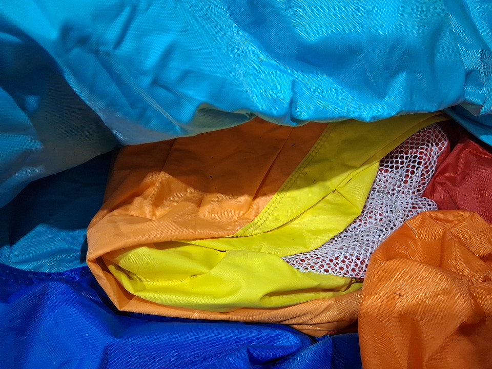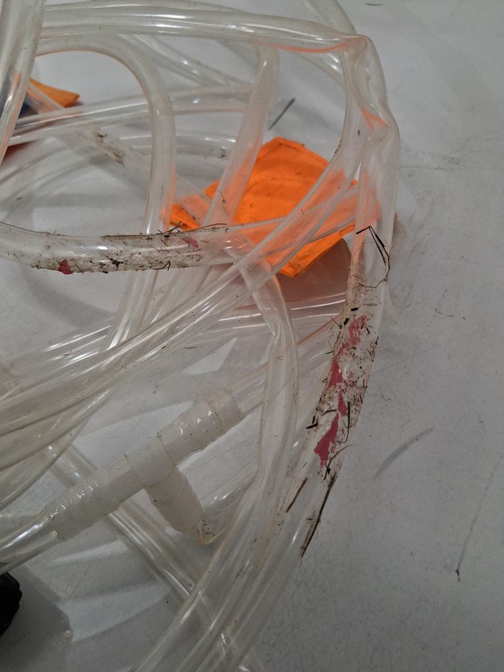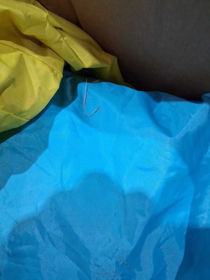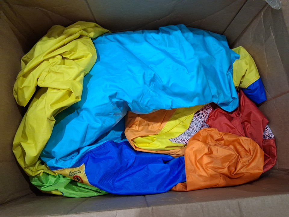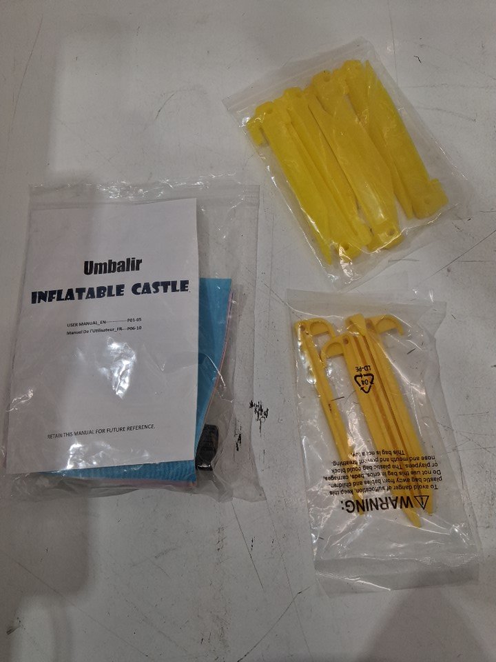 There is no blower included in the box for inflating the castle, so customer will need to supply their own replacement. Additionally, there are some dirt/grass stains on some parts of the castle and the plastic tubing indicating some previous use, but there appears to be no major damage or issues that would affect usability - see photos.
