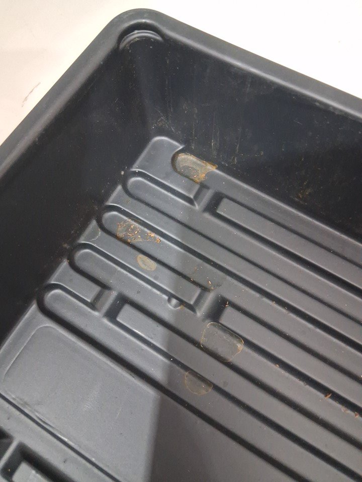 there is a slight crack on the side and some dirt stain in the corner.