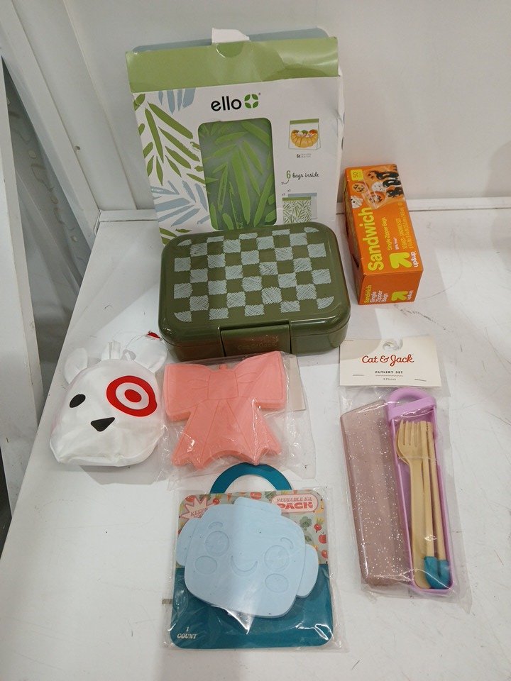 7 assorted lunch supplies - bags, bento box, cutlery and ice packs