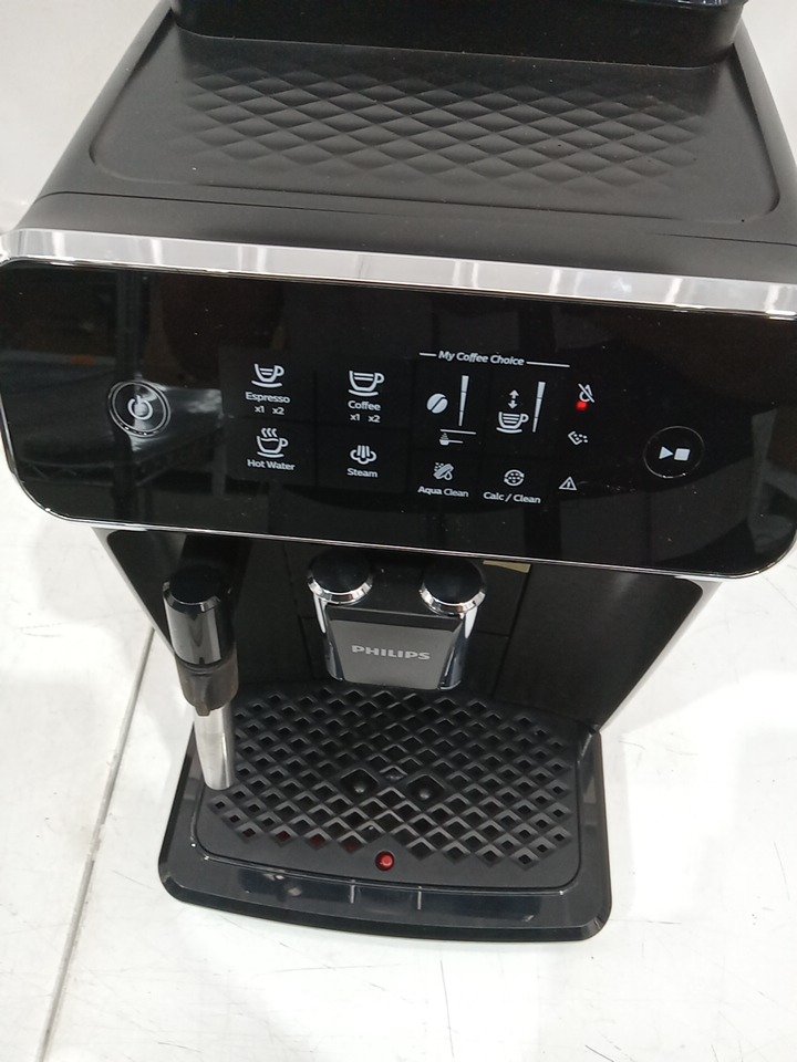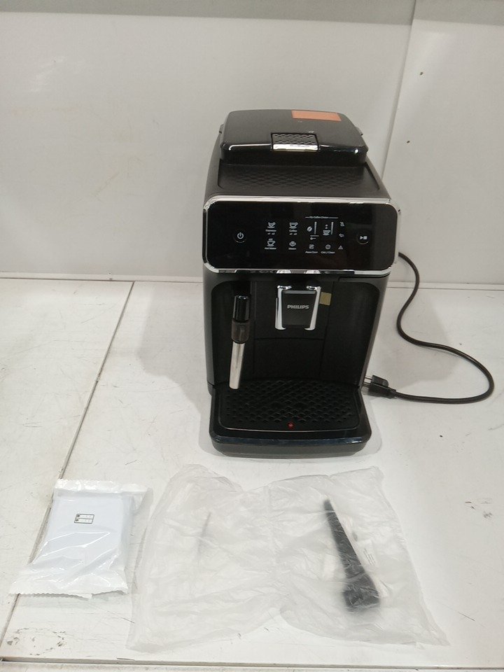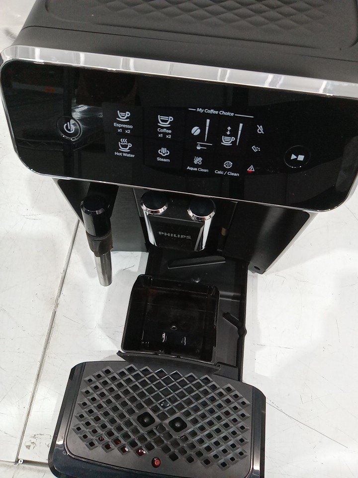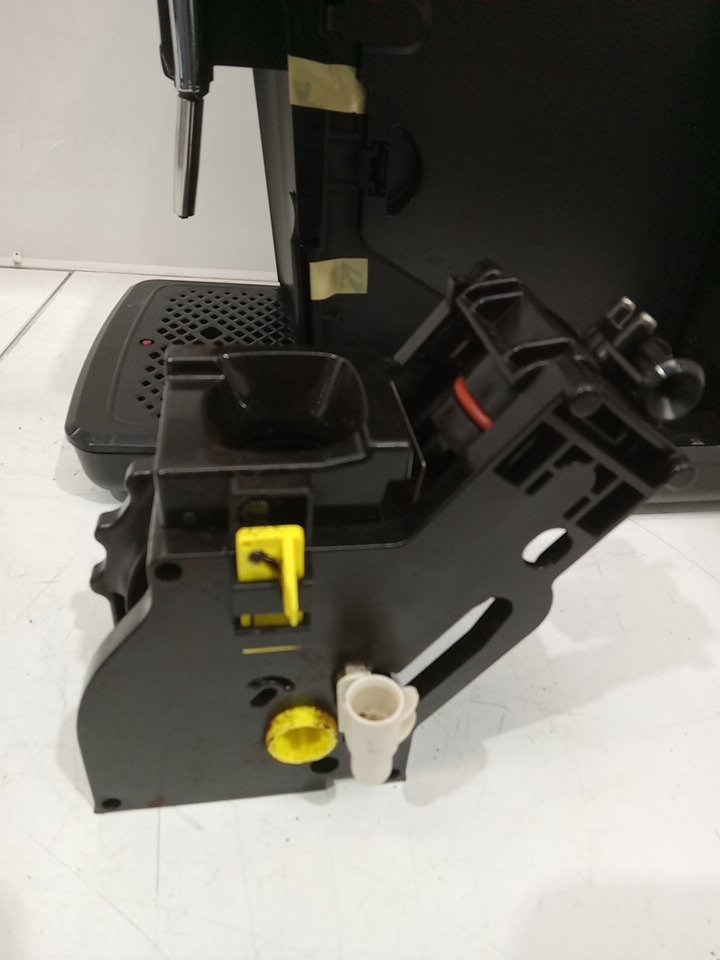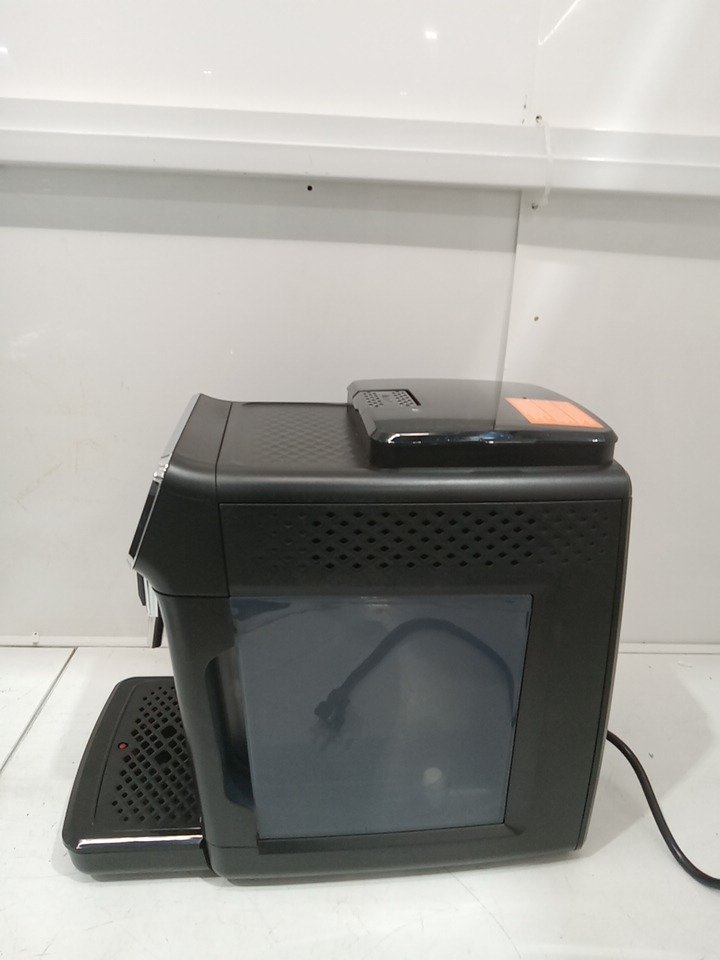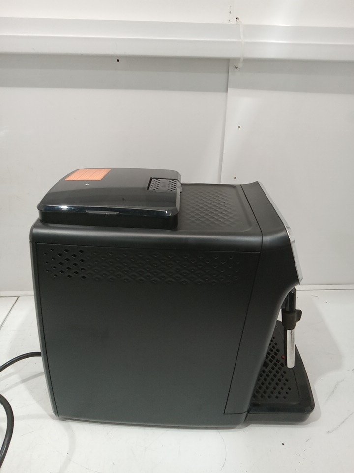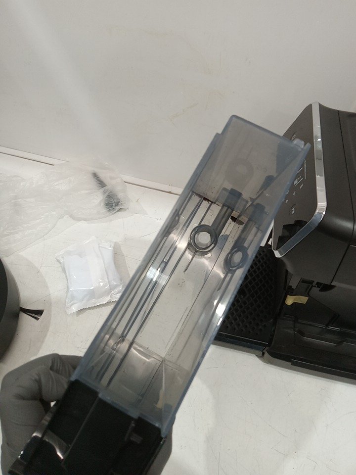 The manual is missing from the original packaging. The aqua filter arrived sealed. There are coffee residues on the top and in the grinder. There are minor scratch marks on the sides and drip tray, and there are water stains on the water tank, all indicating prior use. Tested for basic power only. (Please see photos)