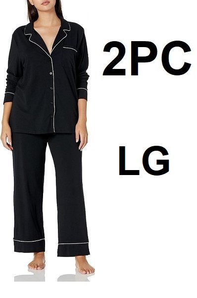 2PC WOMEN'S Amazon Essentials Cotton Modal Long Sleeve Shirt Full Length Pant Pajama Set - Large - BLACK (STYLE:AEW30115F21)