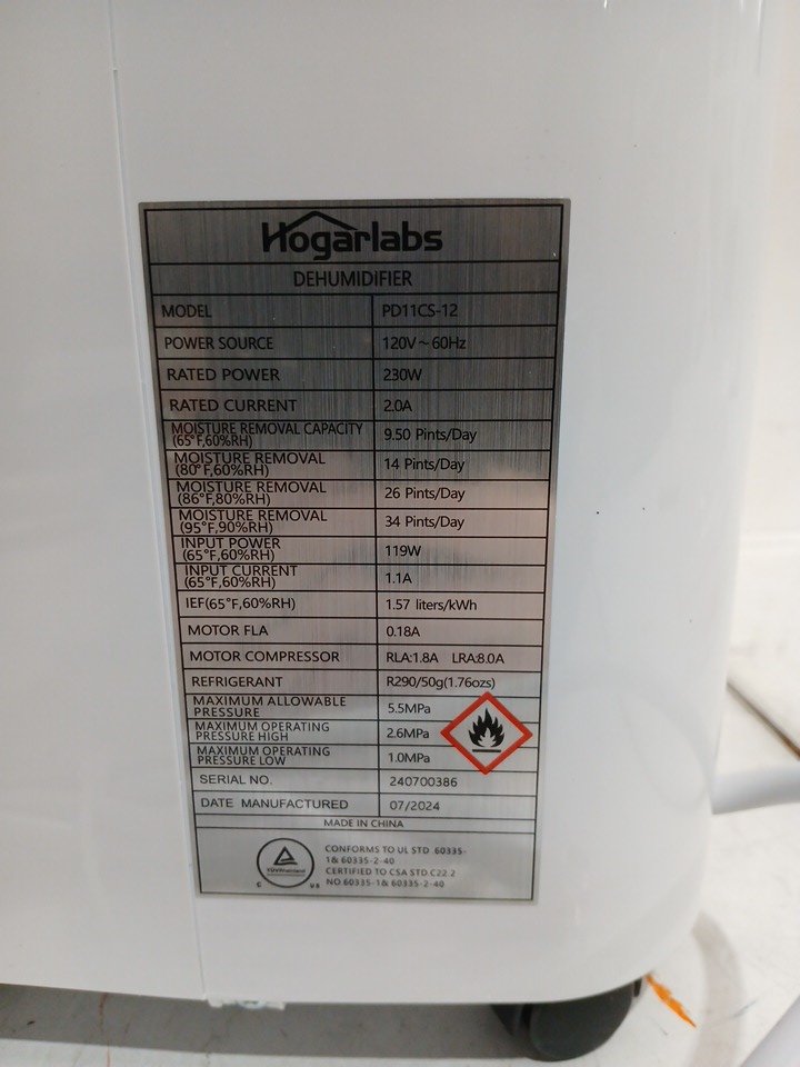 HOGARLABS HOME DEHUMIDIFIER WITH INTELLIGENT HUMIDITY CONTROL - 2000SQ.FT 2.5L - WHITE - (MODEL: PD11CS-12L)