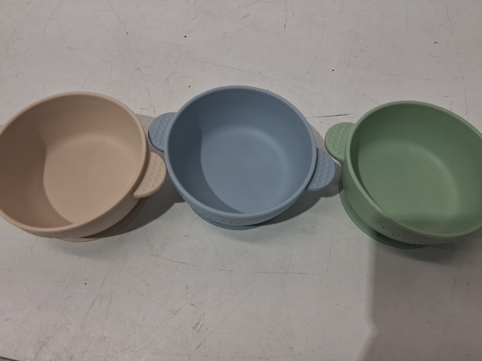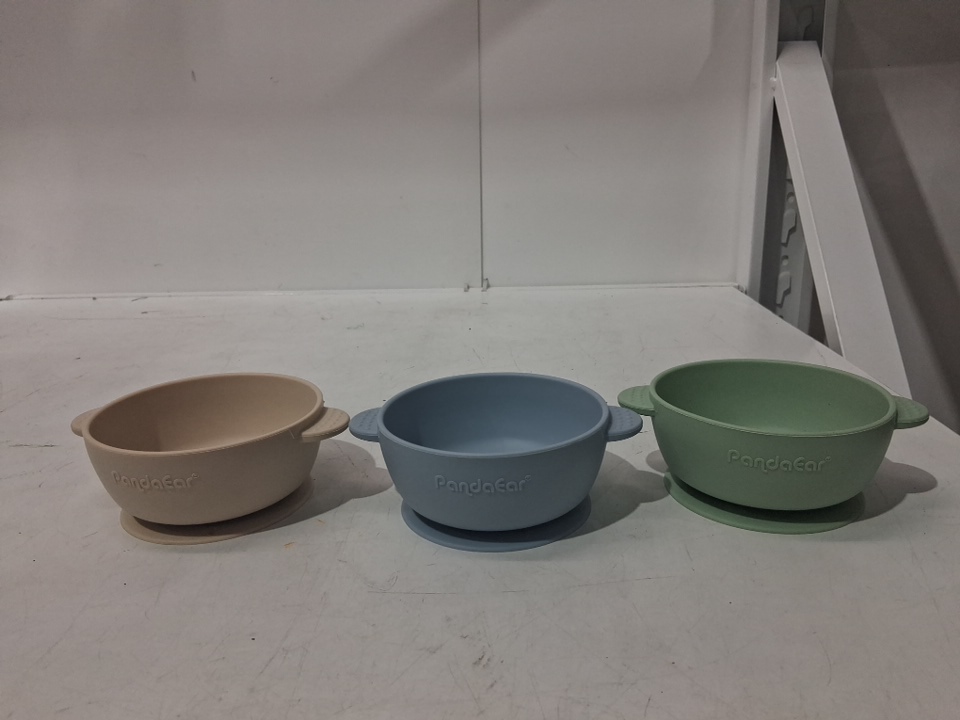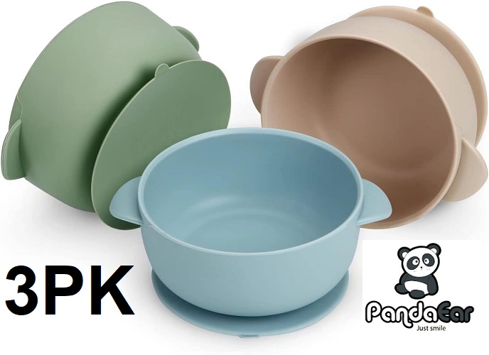 3pk pandaear silicone non-slip suction bottom bowls - blue, beige, green