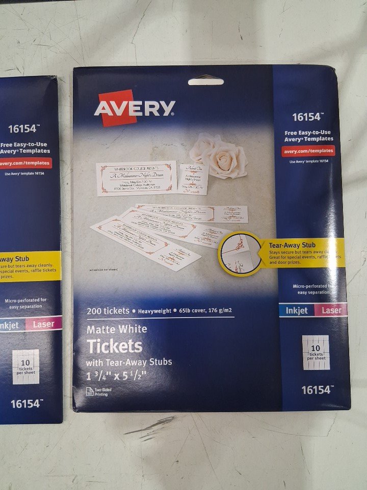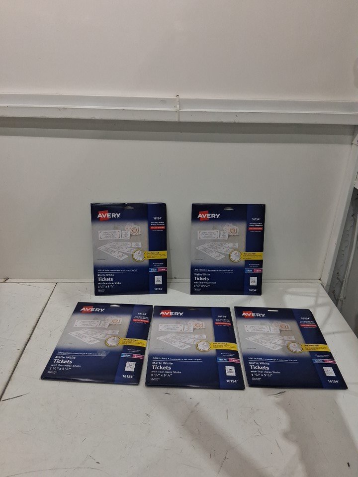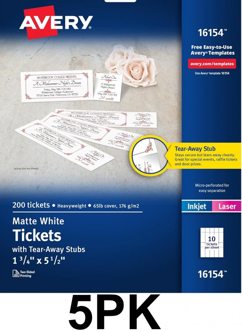 5PK Avery laser/inkjet Printable Tickets with Tear-Away Stubs - 1, 3/4" x 5, 1/2" - 10 Tickets per sheet, 200 tickets each package (1000 Tickets total) - white (model: 16154)
