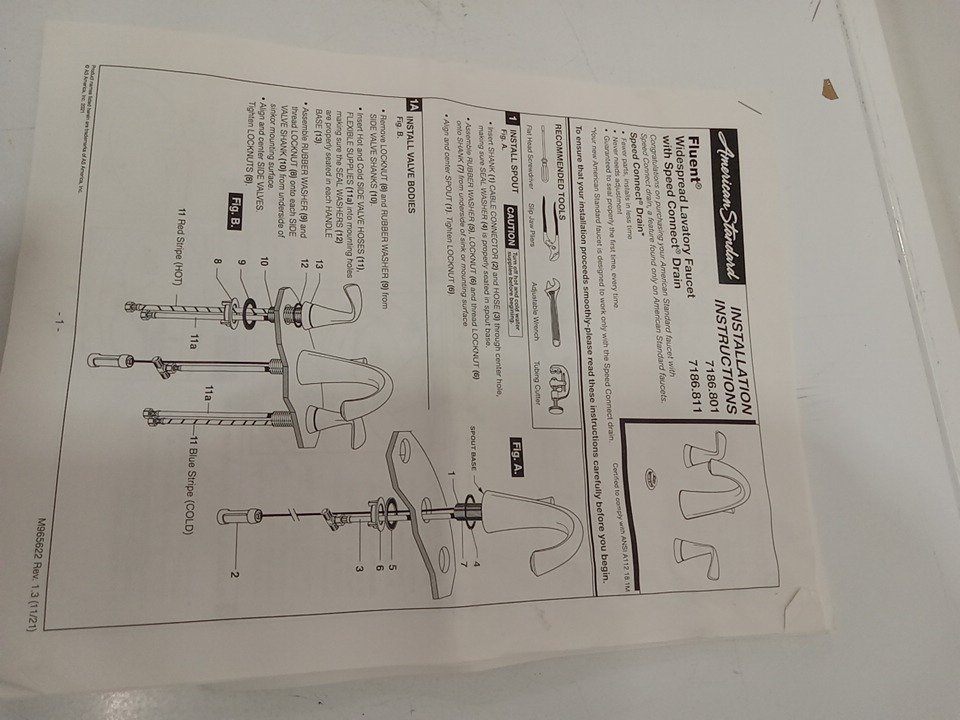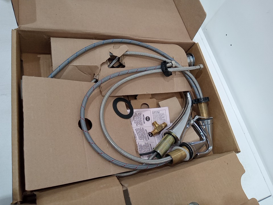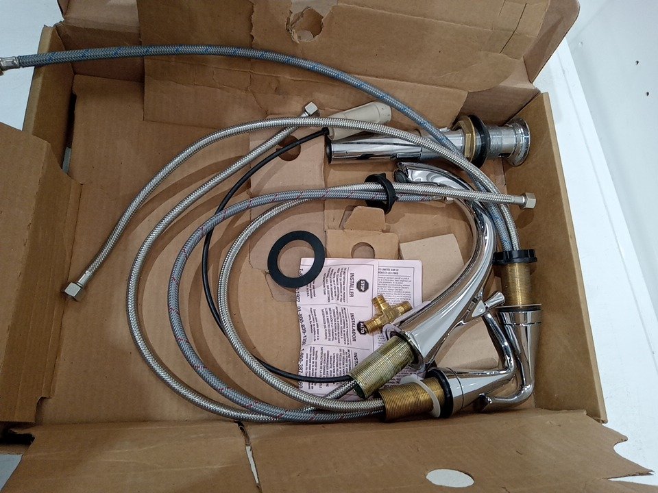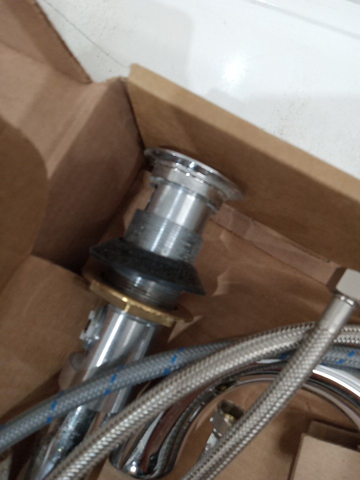 Item has hard water and assembly marks present from previous use. It may require additional hardware for full assembly.
