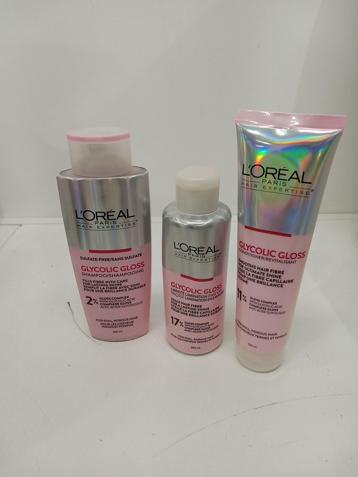 3pc L'Oréal Paris Hair Expertise Glycolic Gloss Shine Trio Set - lamination rinse-off, shampoo, and conditioner - 150ml, 200ml, 200ml