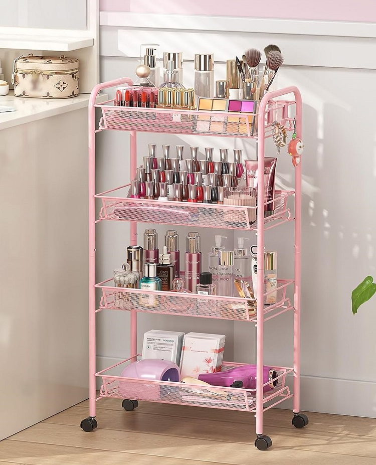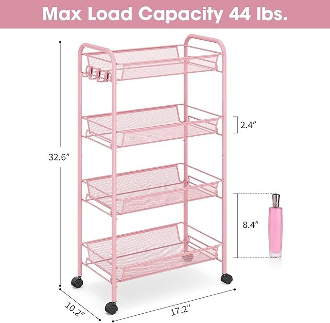 TOOLF 4 Tier Rolling Utility Cart - 17" x 10" x 33" - pink (model: MRC-P)