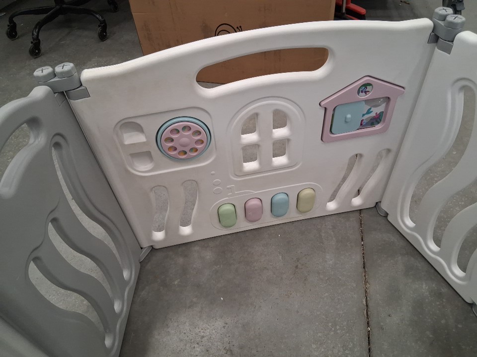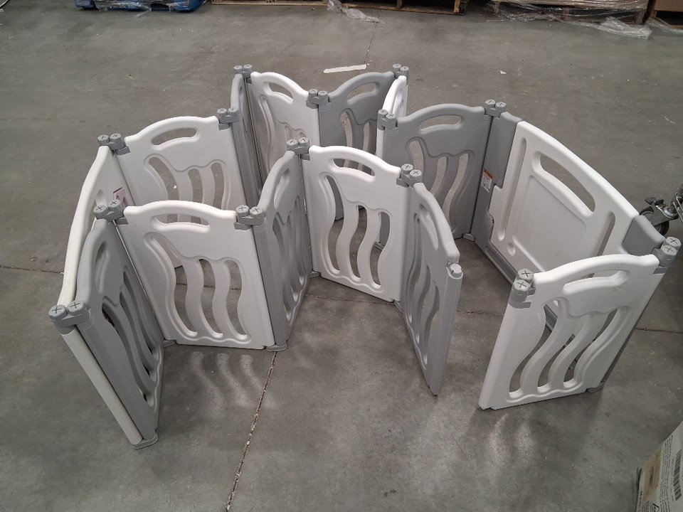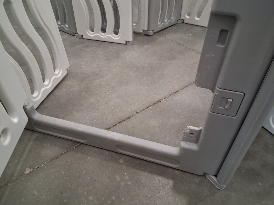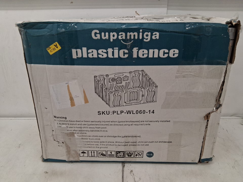 There are some dirt stains on some sections of the fence and on the underside, and the gate has a lot of scuffs and some cracking around the bottom of it, indicating previous use - see photos. Outside of this cosmetic damage, the fence appears to be in good working condition without any structural issues.