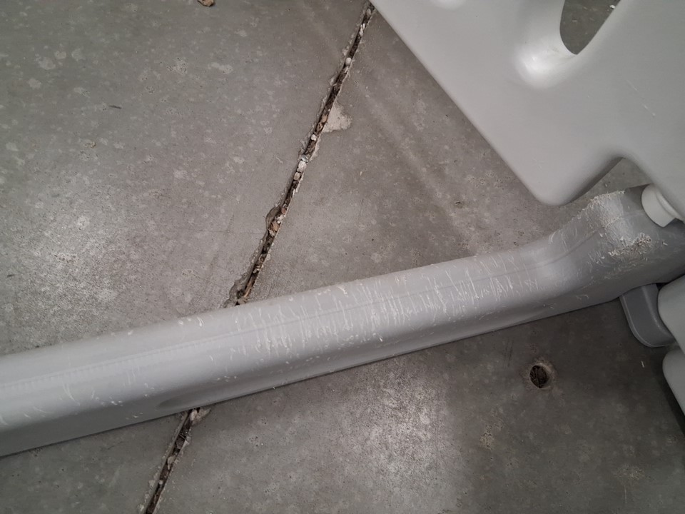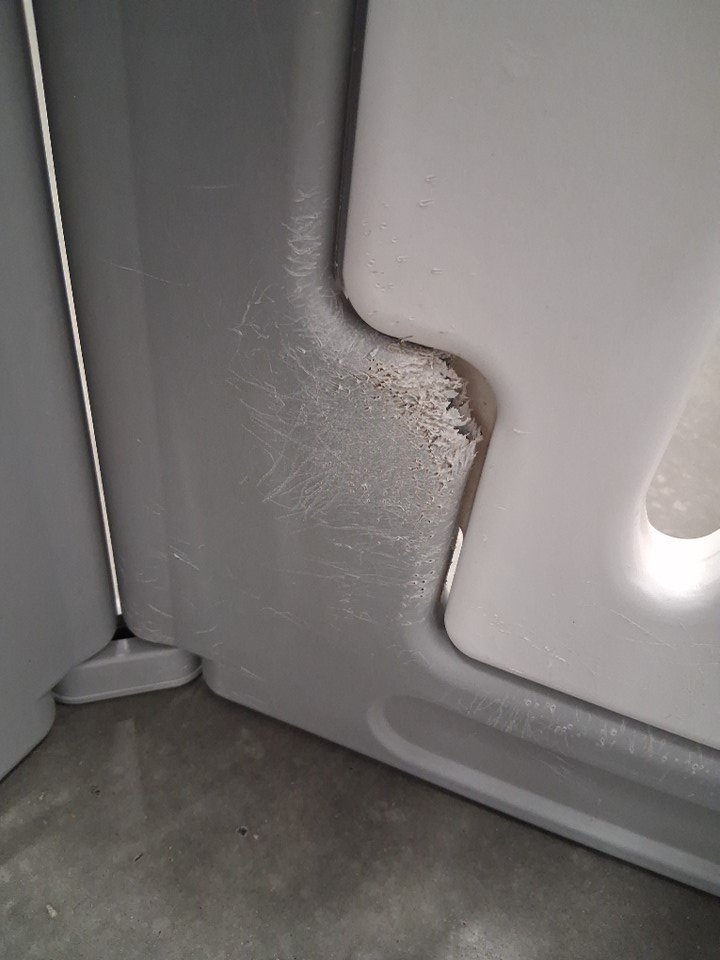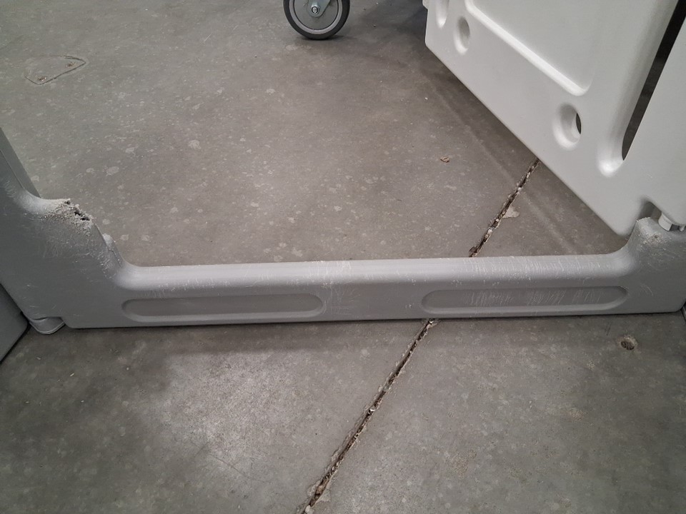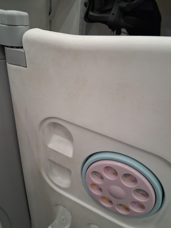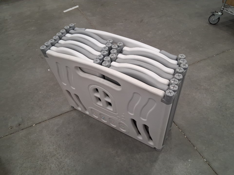 There are some dirt stains on some sections of the fence and on the underside, and the gate has a lot of scuffs and some cracking around the bottom of it, indicating previous use - see photos. Outside of this cosmetic damage, the fence appears to be in good working condition without any structural issues.