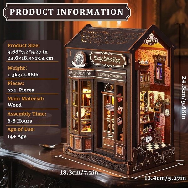 SUNNINO diy minature coffee shop book nook with led lights - 9.6'' x 5'' x 7'' - multicolour