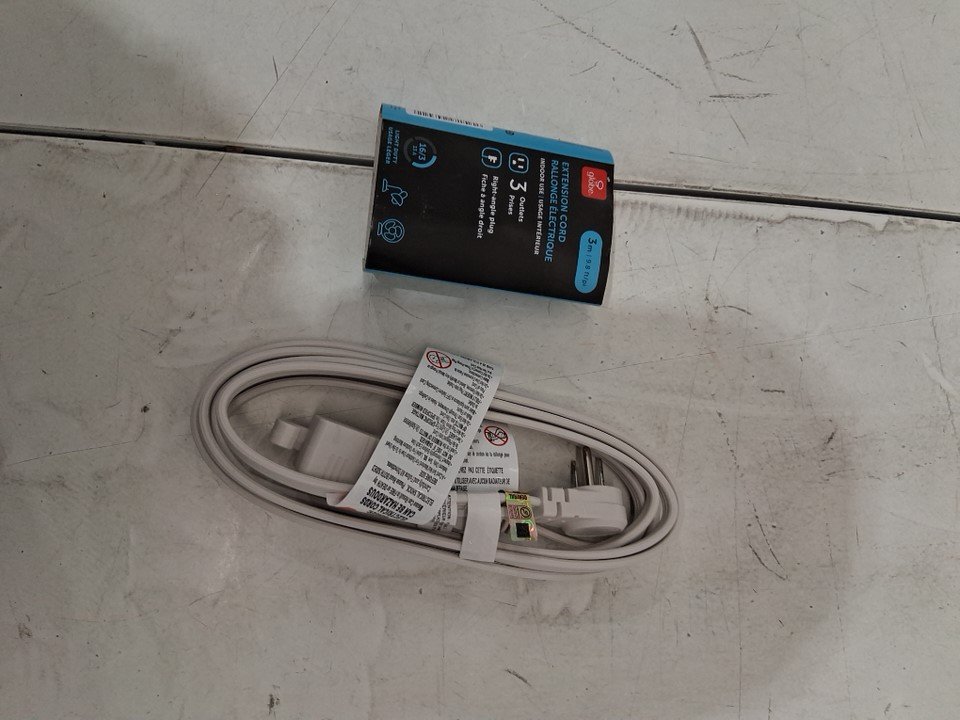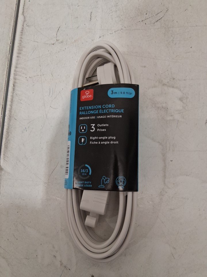 GLOBE ELECTRIC 3-OUTLET INDOOR EXTENSION CORD WITH RIGHT-ANGLE PLUG - GROUNDED - 9.8FT - WHITE