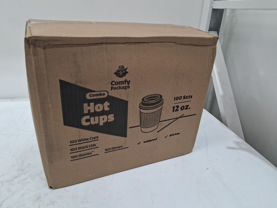 100PK GUSTO Insulated Kraft Paper Hot Cups with lids, sleeves and stirrers - 100 each - 12oz - black/white