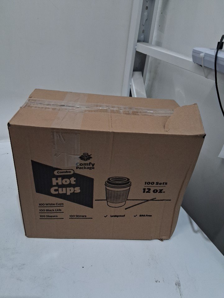 100PK GUSTO Insulated Kraft Paper Hot Cups with lids, sleeves and stirrers - 100 each - 12oz - black/white