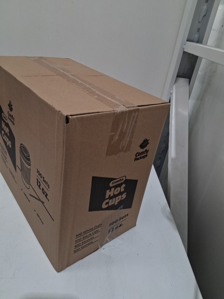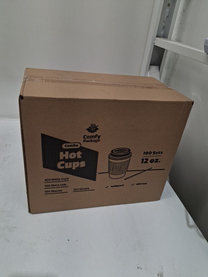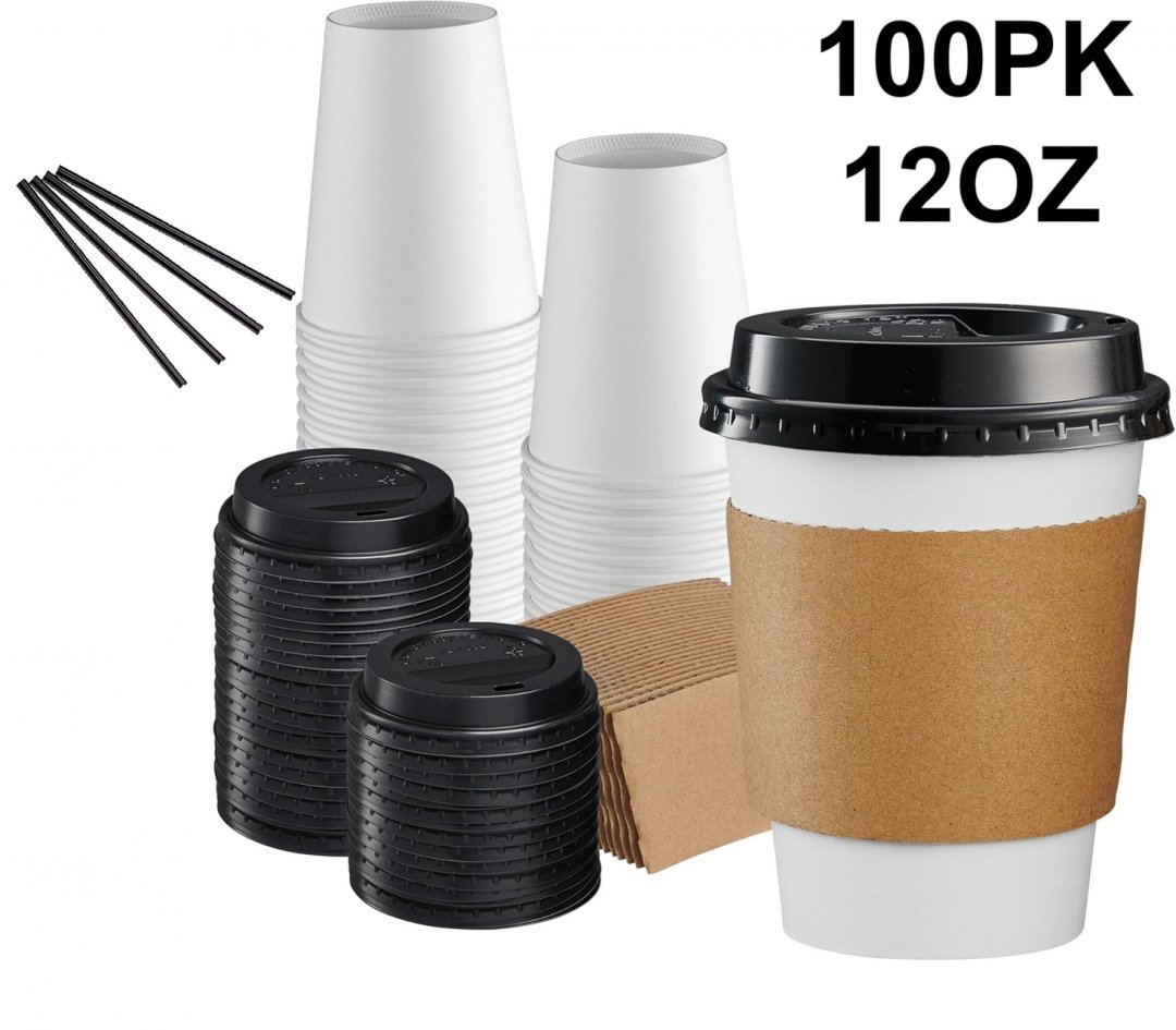 100PK GUSTO Insulated Kraft Paper Hot Cups with lids, sleeves and stirrers - 100 each - 12oz - black/white