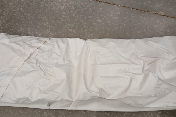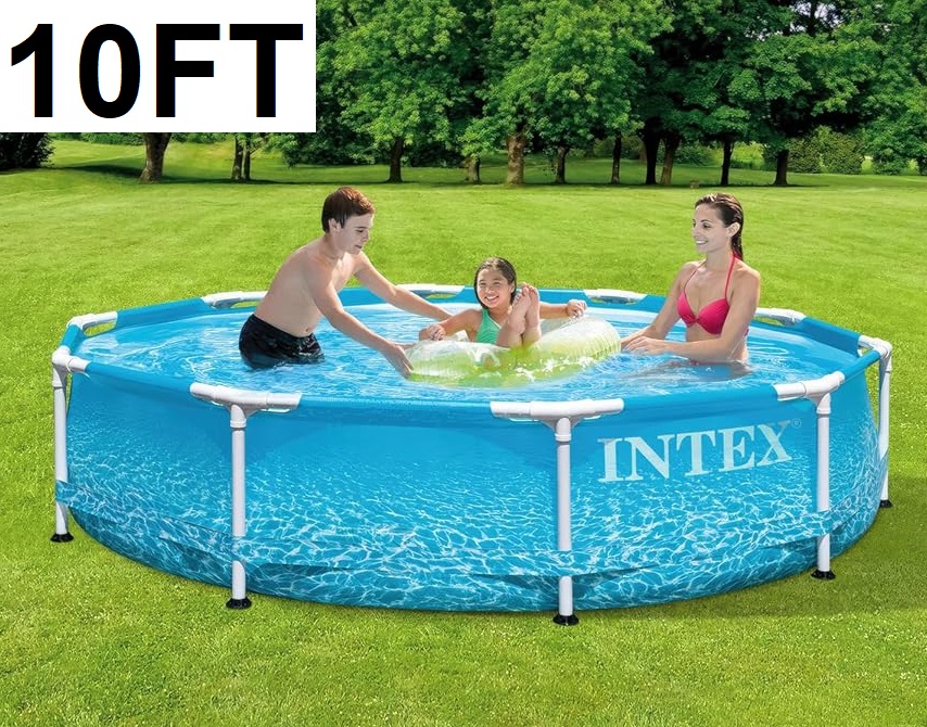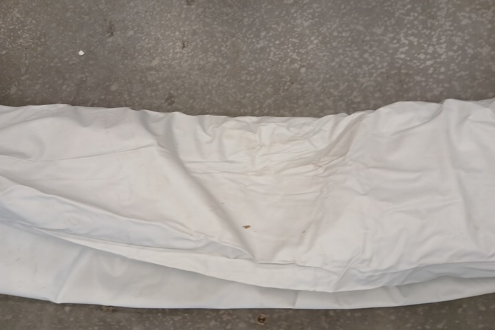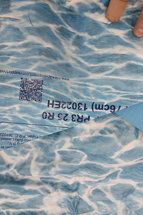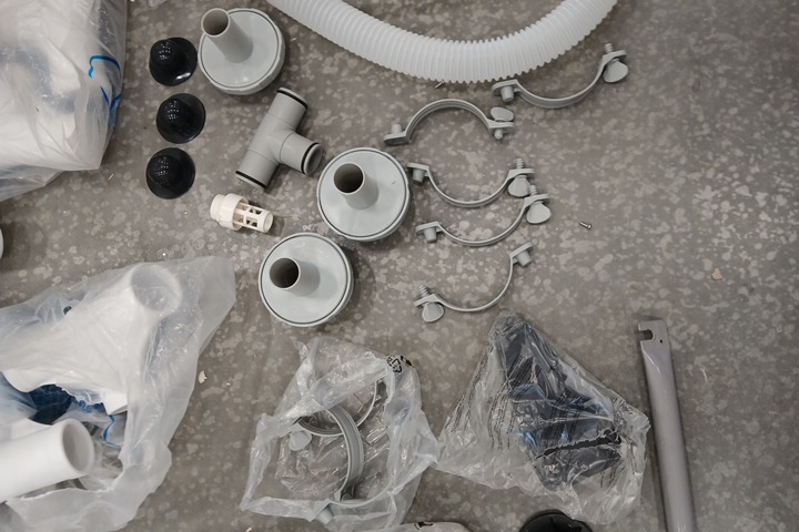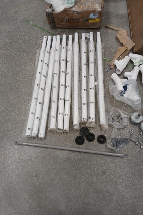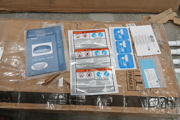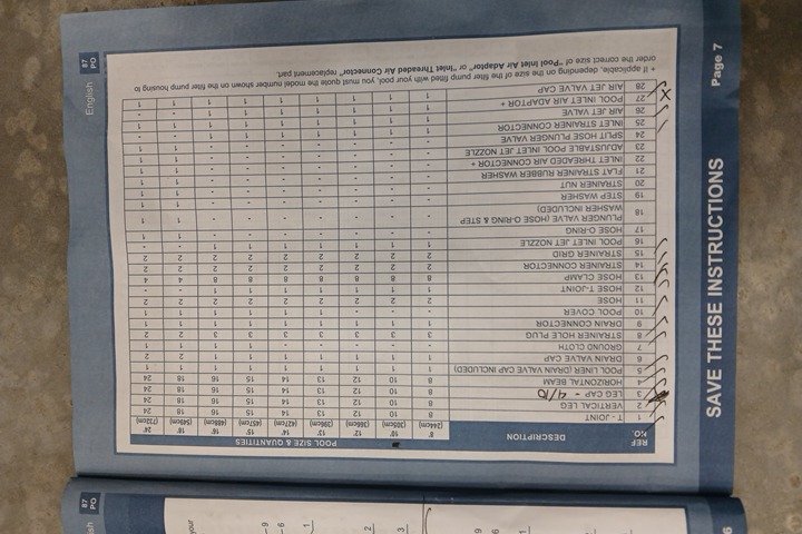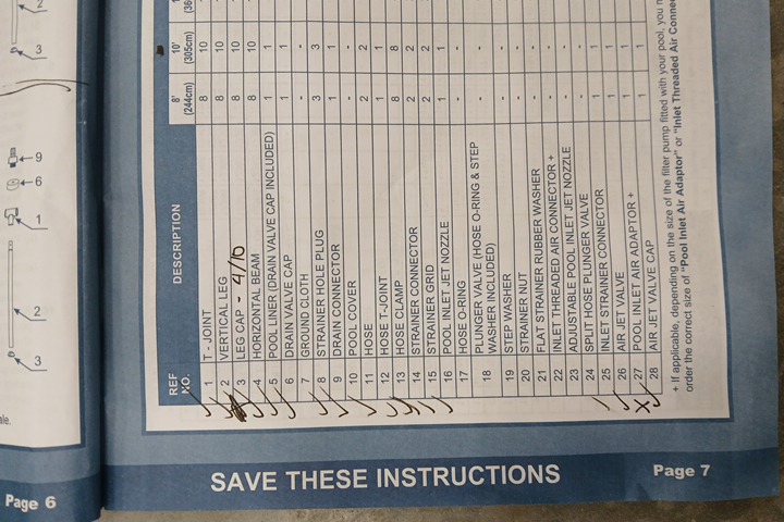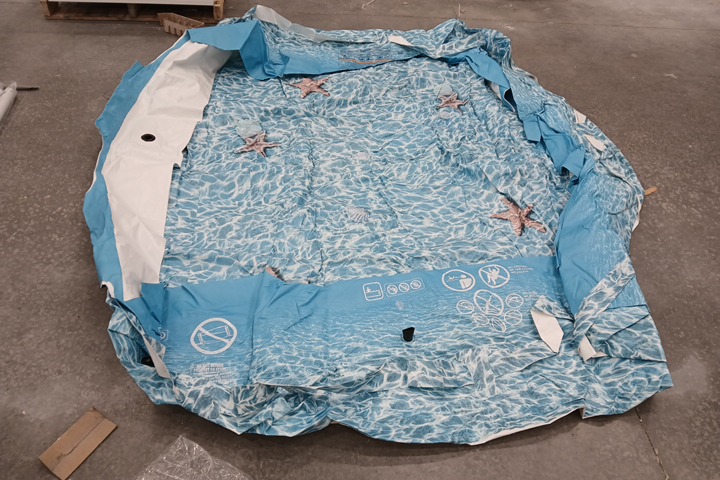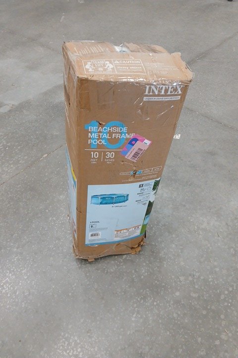 Appears to be missing 6 of the 10 leg pole bottoms as w2ell as the pool inlet air adaptor + Grass on the underside and many parts look non assembled, so likely not used but partially built or at least the liner laid out outside. Additional dust/dirt from warehouse inspection Pump not included in this model