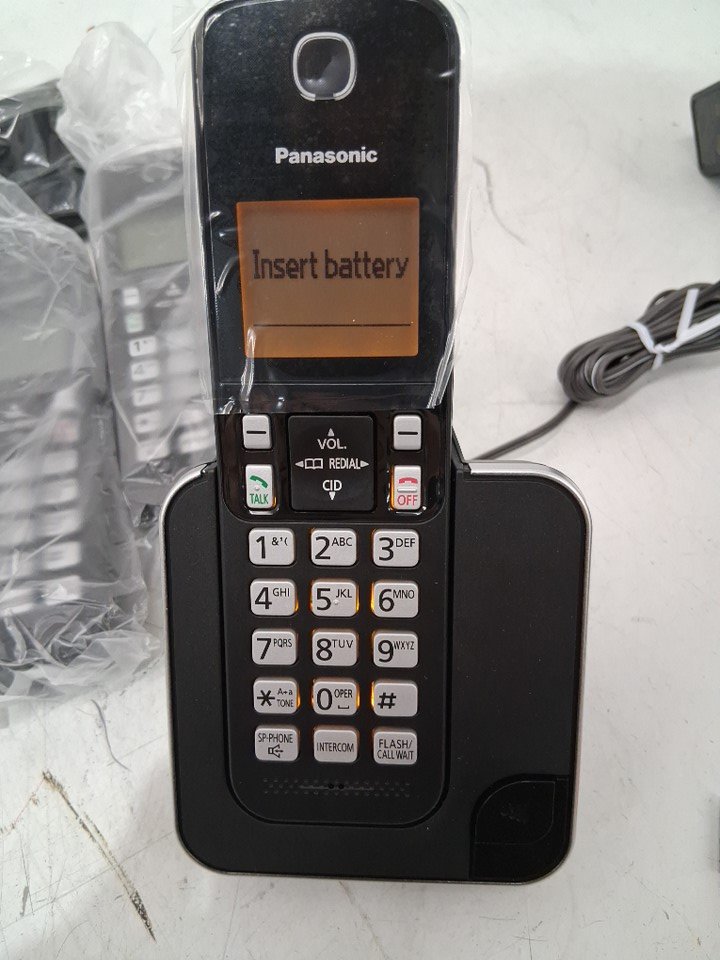 PANASONIC CORDLESS 4-HANDSET LANDLINE TELEPHONE - SHOCK RESISTANT & COMPATIBLE WITH HEARING AID T-COIL - BLACK - (MODEL: KX-TGC384C)
