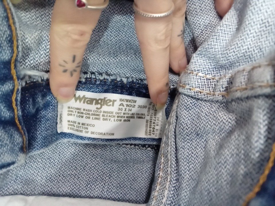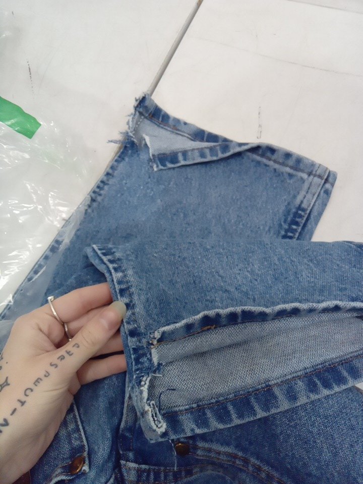 the bottoms of the legs are ripped, indicating being worn.