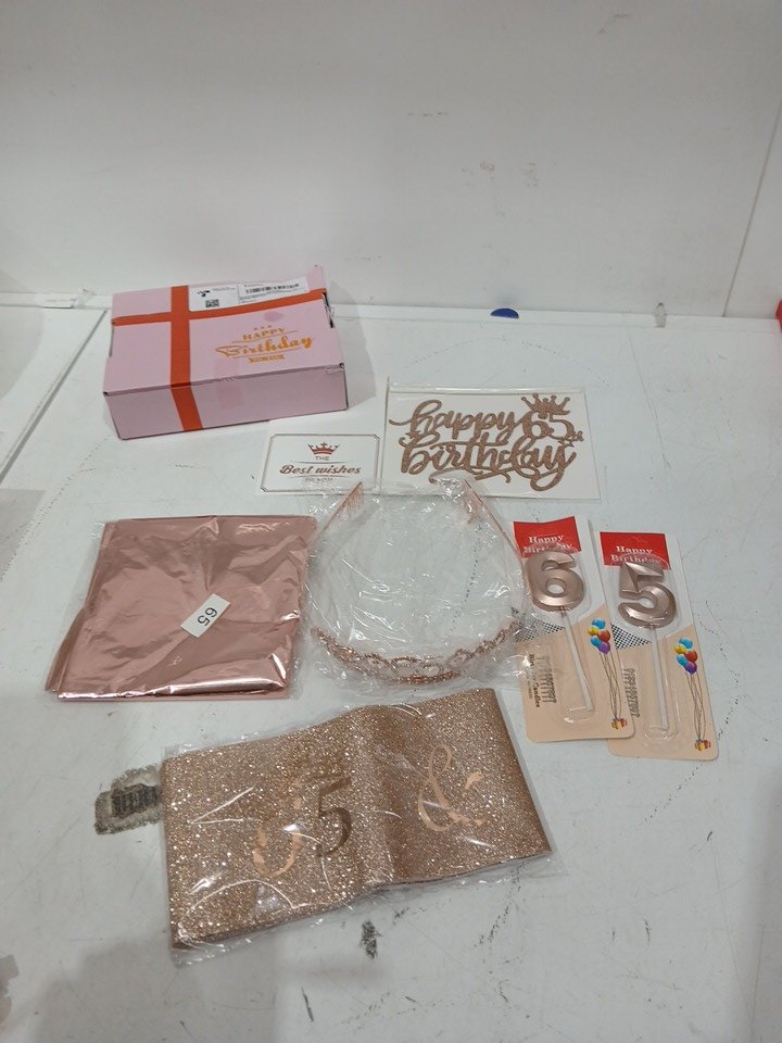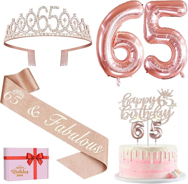 women's 65th Birthday Decorations with tiara/crown/sash/candles/balloons - pink