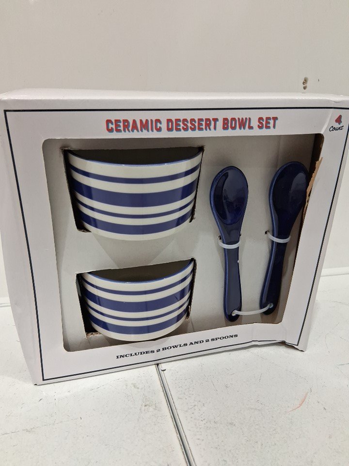 4PC ceramic dessert bowl and spoon set - blue stripe