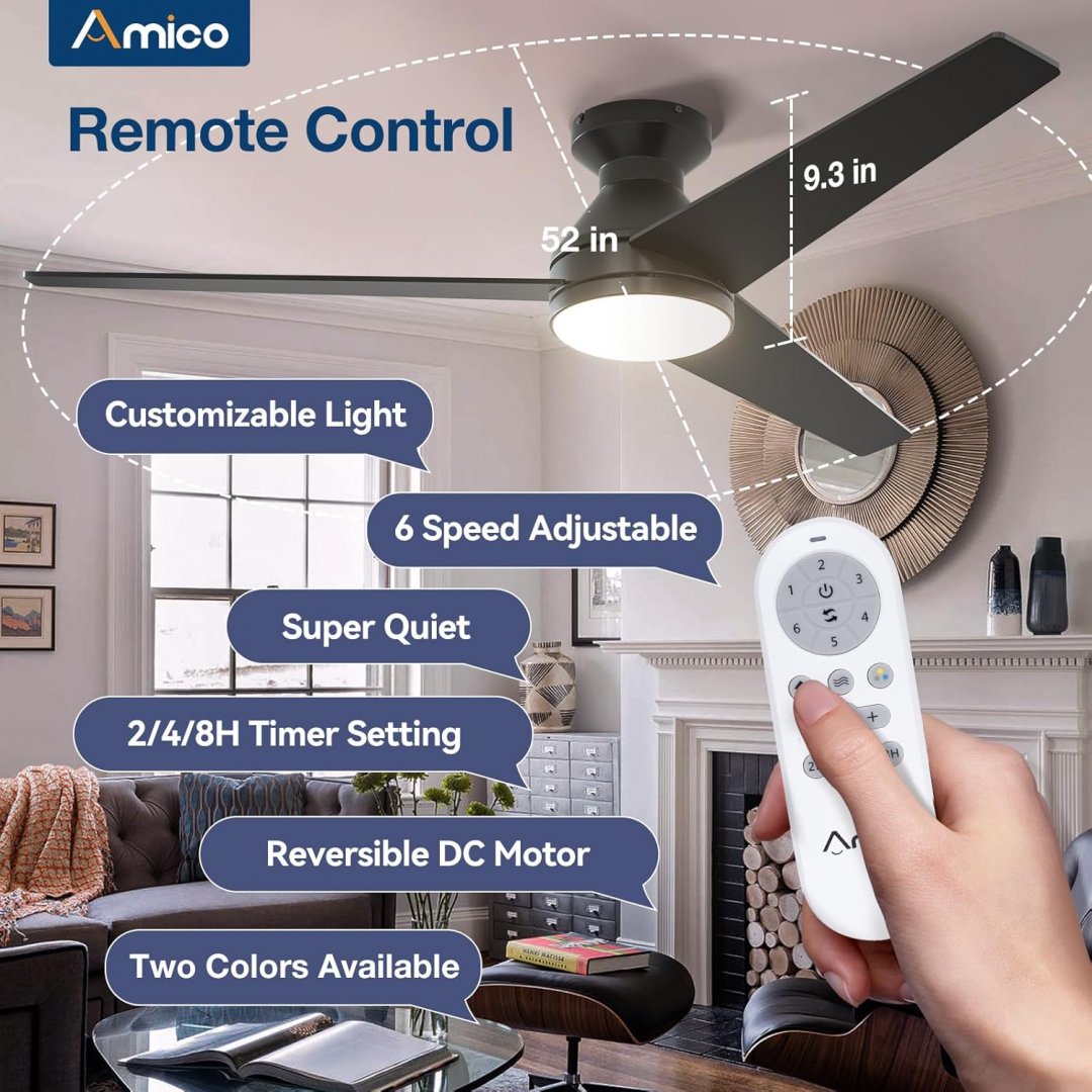 Amico Low Profile Noiseless Ceiling Fan and Dimmable Light with Remote Control - 6 speeds - 52" (model: ‎KFM52PLY01R1-CA)