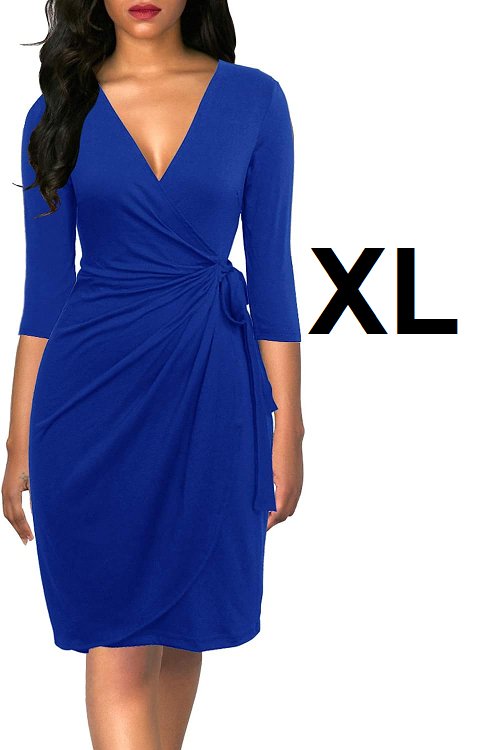 Women's deep v neck 3/4 sleeve wrap dress - Extra Large - Blue