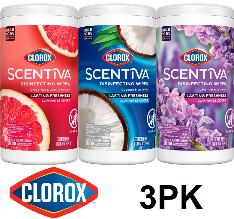 3pk clorox Scentiva Disinfecting Wipes - 75 wipes/pack - grapefruit & orange blossom/ coconut & waterlily/ lavender & jasmine