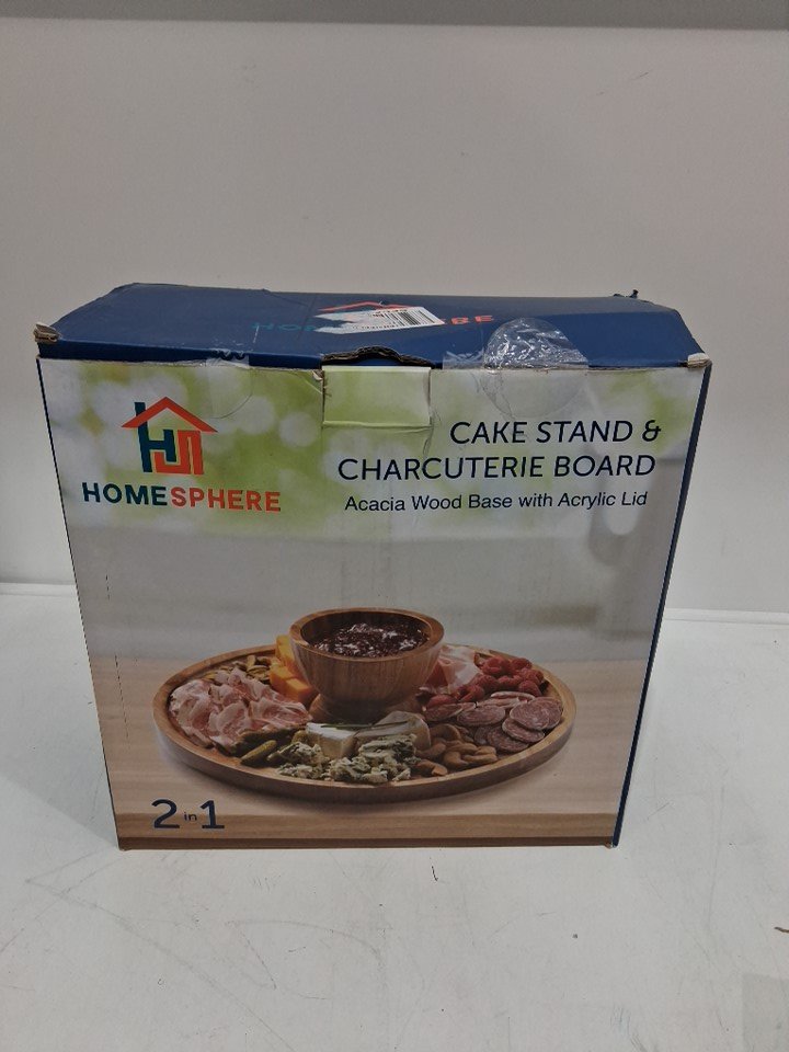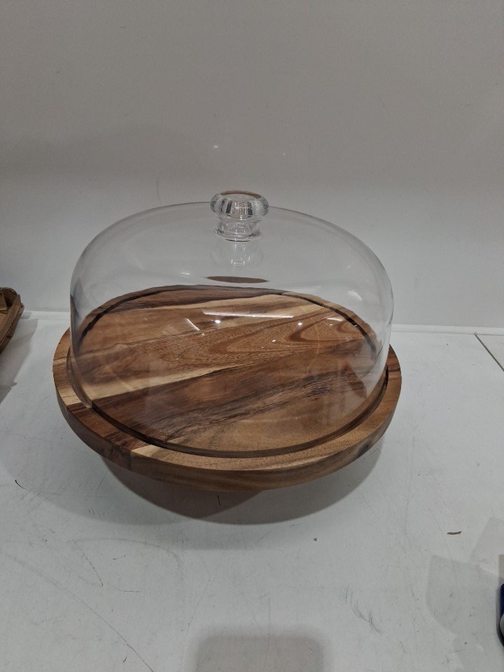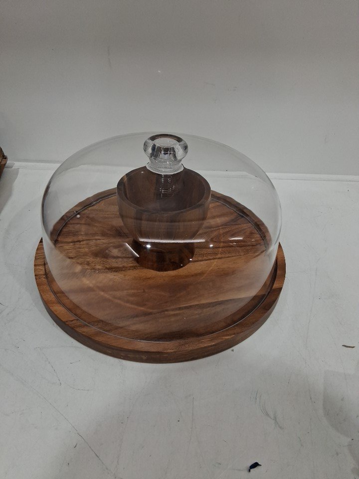 HOMESPHERE 2-IN-1 acacia wood CAKE HOLDER WITH acrylic LID AND charcuterie board - 12" - brown/clear