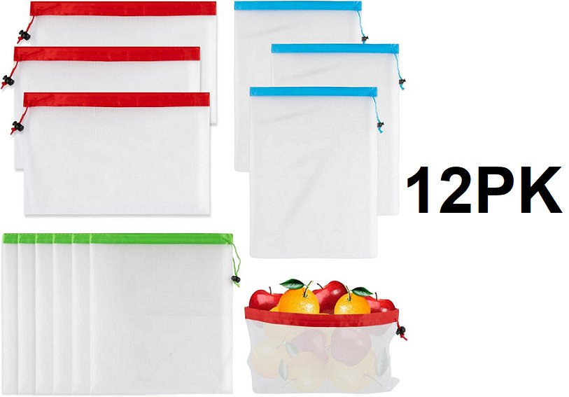 12PK MAQIHAN REUSABLE MESH PRODUCE BAGS - 12" X 7.6" - 12.2" X 16" - 12" X 13.7" - BLUE/GREEN/RED