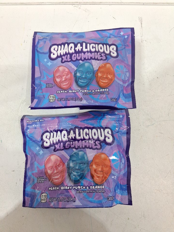 2 SHAQ-A-LICIOUS xl gummies - 334g each - peach, berry punch & orange