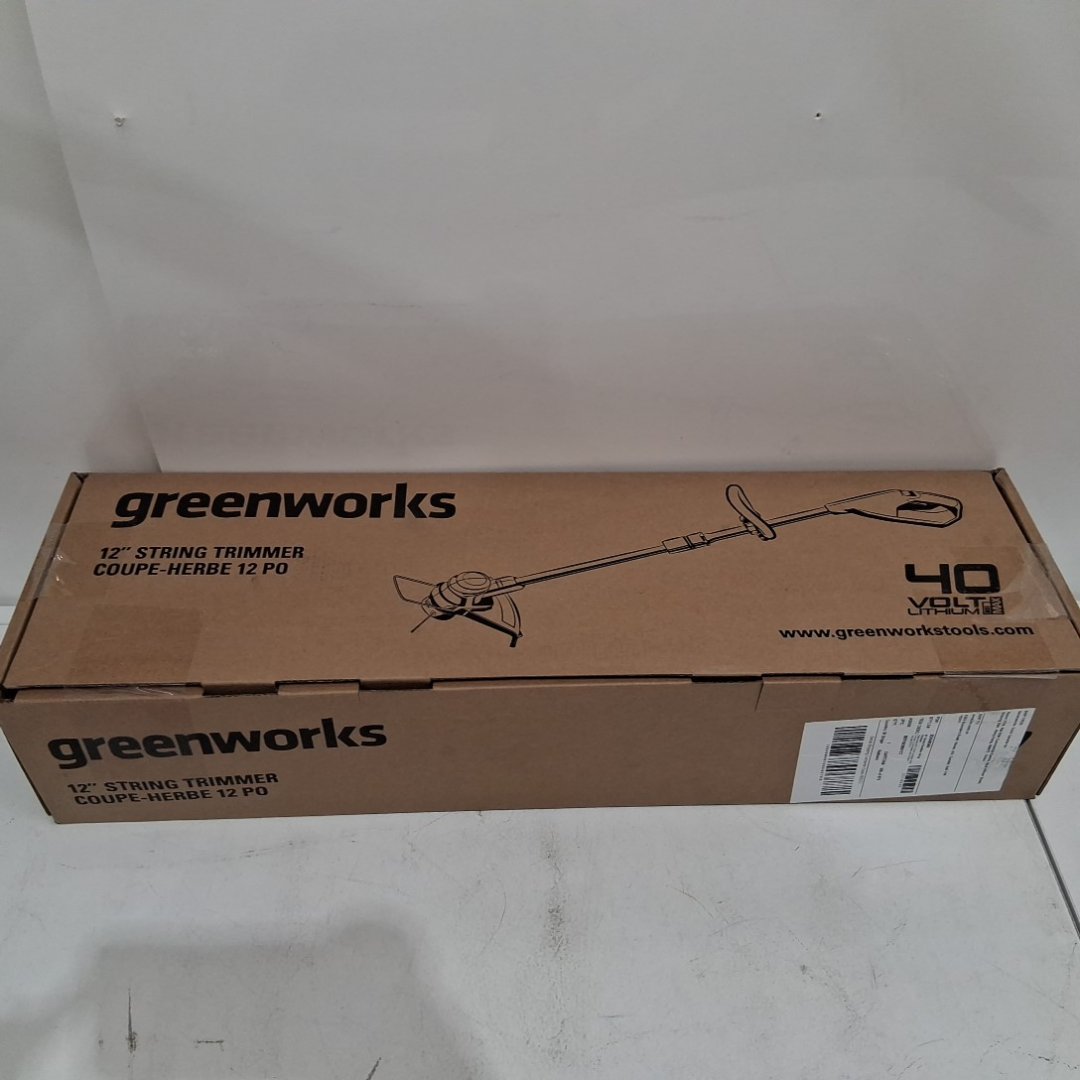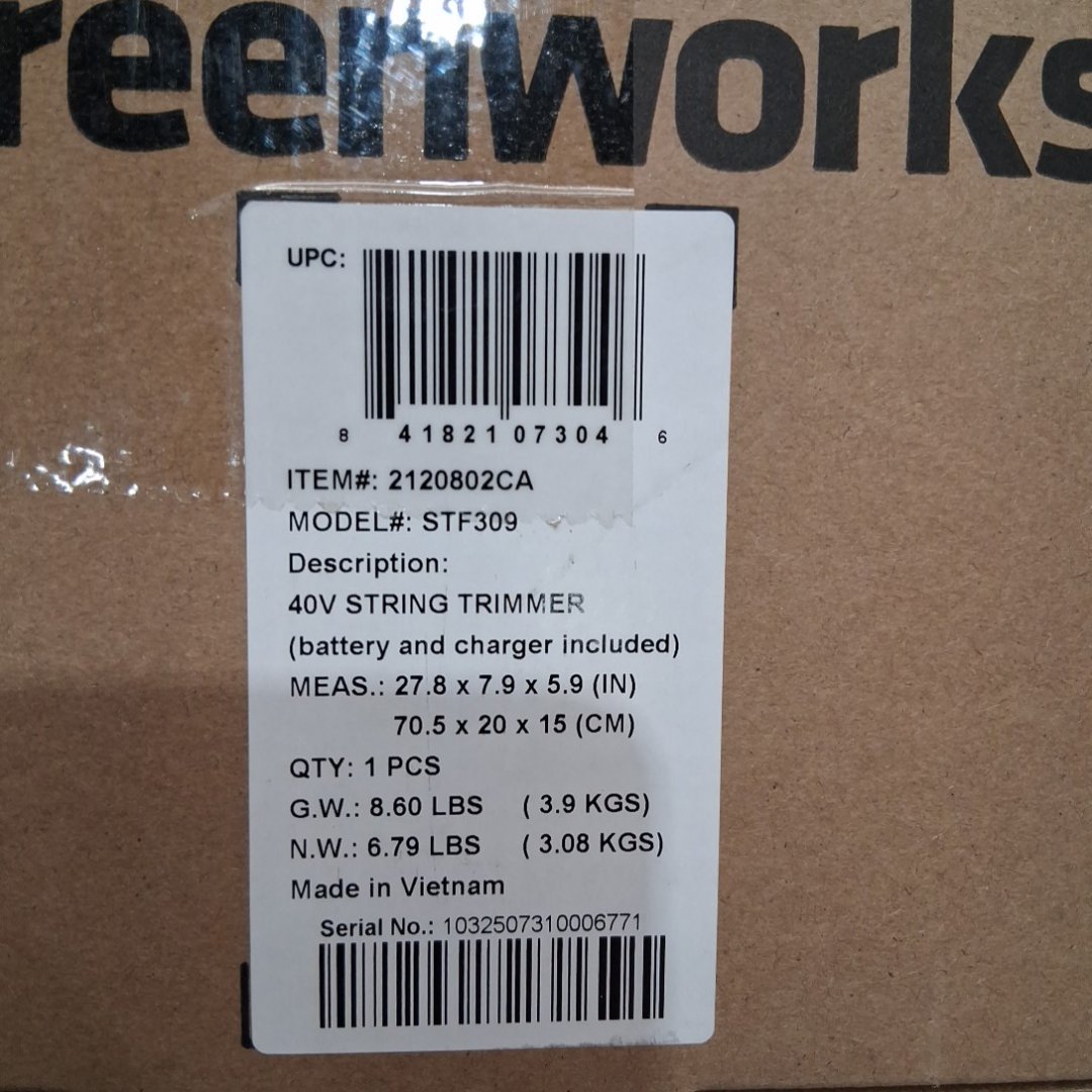Greenworks 40v Cordless String Trimmer with battery & charger- 12"- green/black (Model: stf309)