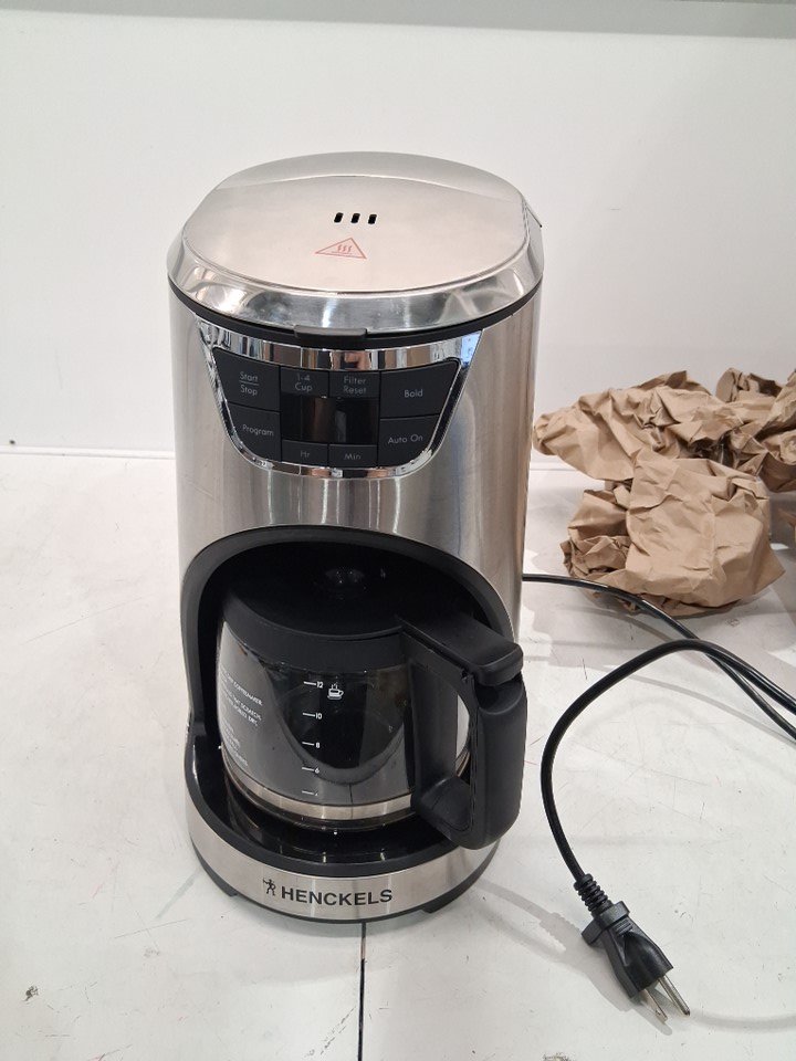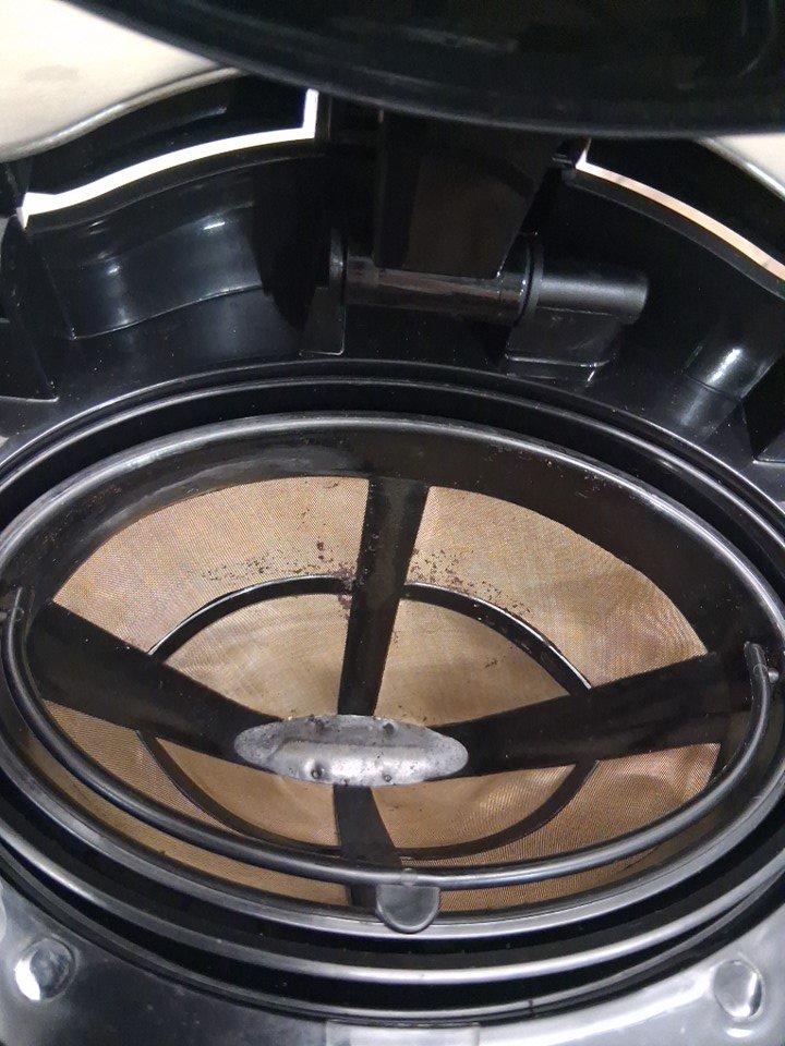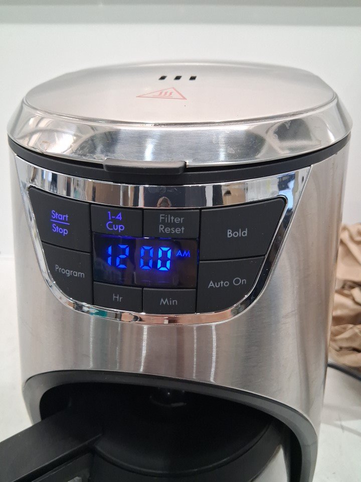 the coffee maker has some stains from use and coffee residue inside flitter, also tested for basic power, see photos.