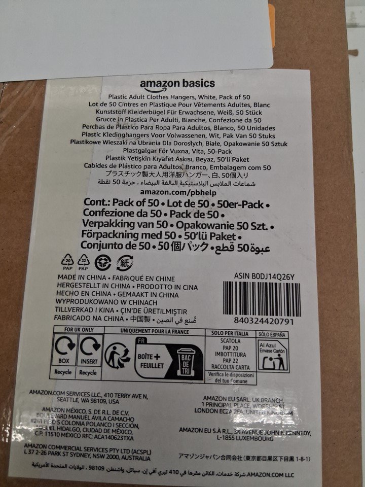 50PK AmazonBasics Plastic Clothes Hangers - adult size - White