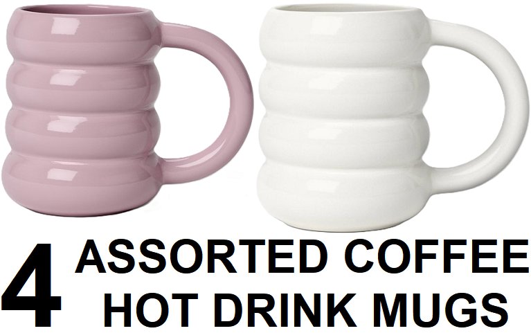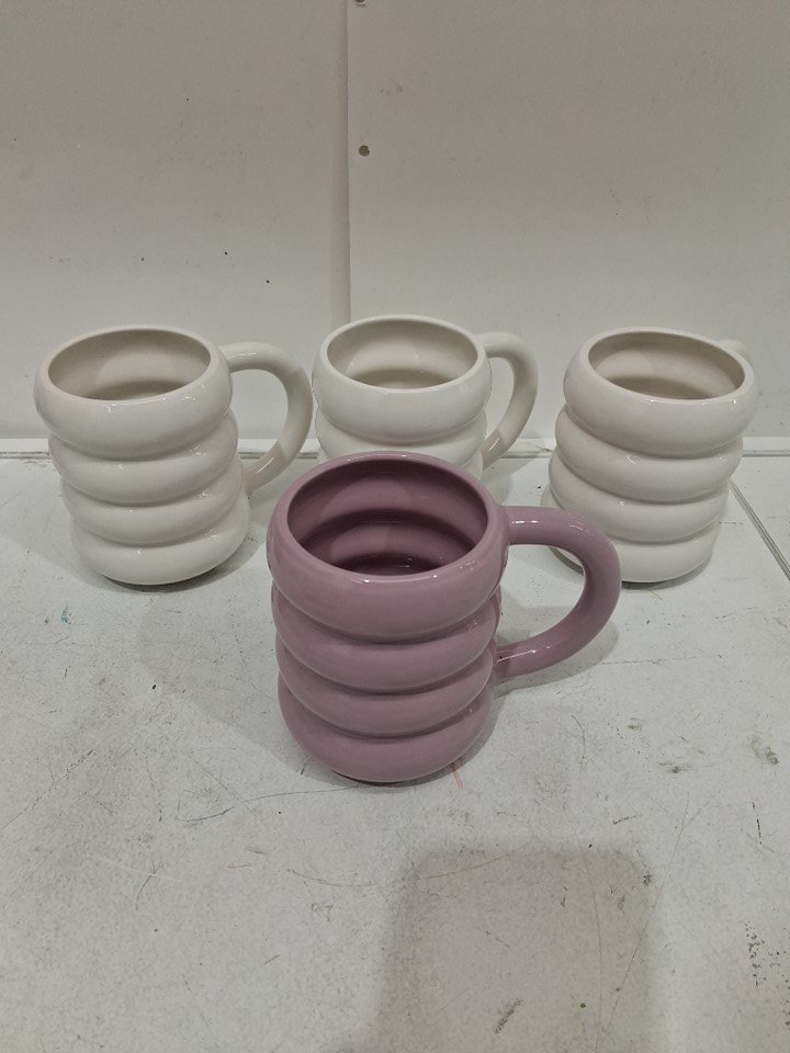 4 ASSORTED room essentials CERAMIC bubble hot drink coffee tea mugs - white / purple