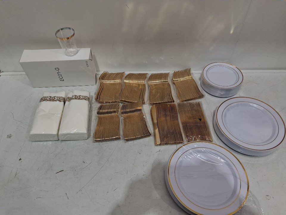 400PC PLASTIC DECORATIVE DINNERWARE SET FOR WEDDINGS AND EVENTS - GOLD/WHITE - (model: RC427-1)