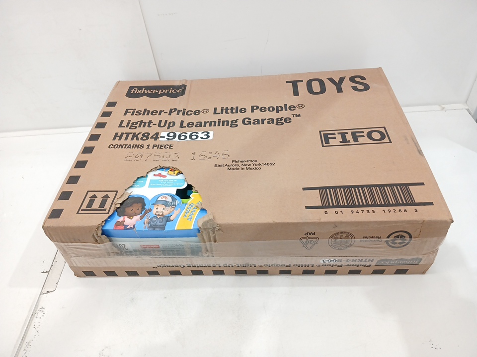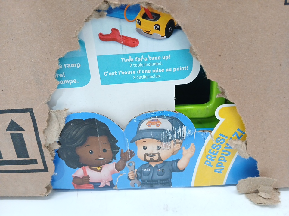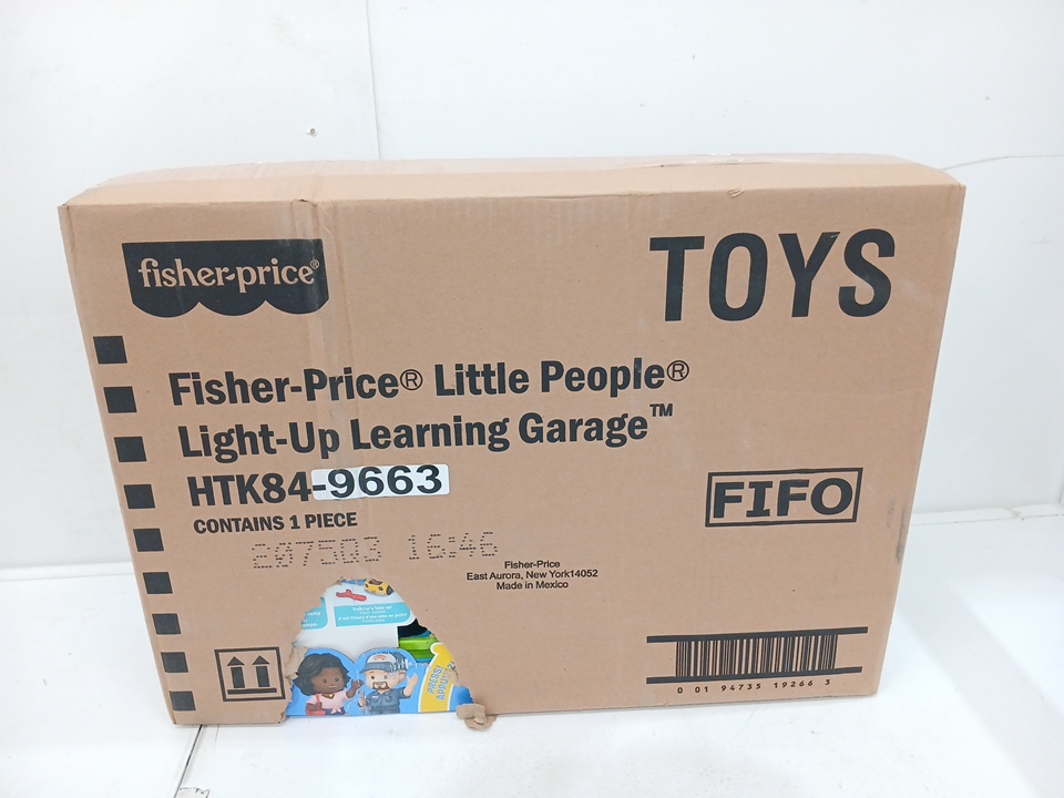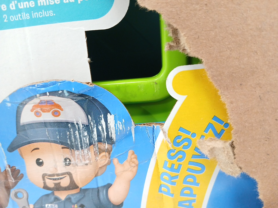 This item is still sealed in its box, but there is a hole in the shipping box. From the hole we can see damage to the toy's box and there is a scuff on the green piece