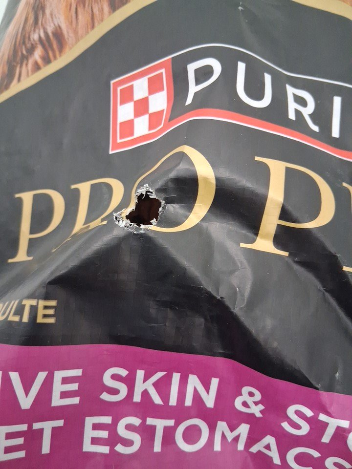 Front of bag has a small hole, bag is only missing a few pieces of kibble
